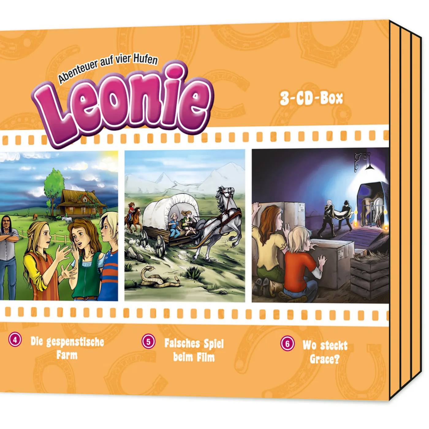 Kinder lieben Leonie - Abenteuer auf vier Hufen! Die zweite Leonie-Sammelbox bietet drei Leonie- Hörspiele mit Preisvorteil. Enthalten sind die Hörspiel-Folgen 4 bis 6: Die gespenstische Farm, Falsches Spiel beim Film und Wo steckt Grace?
