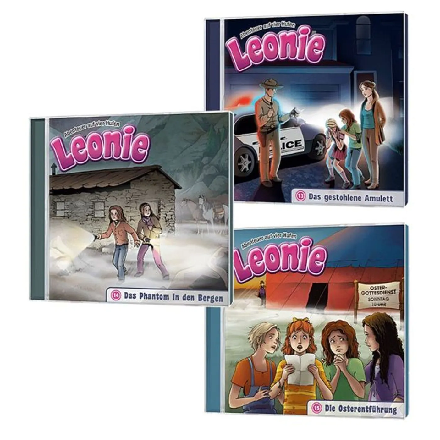 Die Hörspielserie 'Leonie – Abenteuer auf 4 Hufen' erzählt Detektiv-Geschichten mit Leonie und ihren Freunden in 'Green Valley', Kalifornien. Leonie liebt Pferde und hat eine gute Spürnase. Das Set enthält die Folgen 13-15. „Das gestohlene Amulett“, „Das Phantom in den Bergen“ und „Die Osterentführung“.