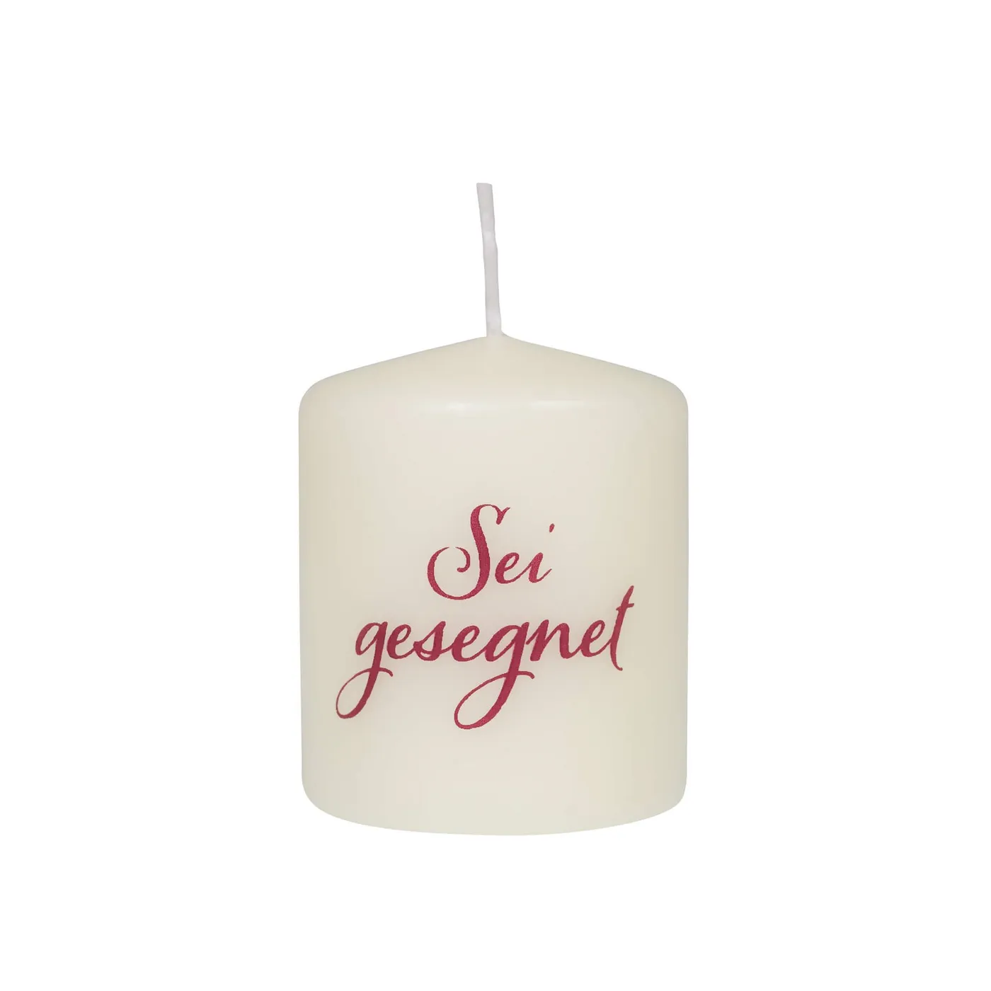 Qualitätskerze aus einer Kerzenmanufaktur in Deutschland. Uljö-eigenes Design, bedruckt mit „Sei gesegnet“ auf elfenbeinfarbener Kerze.