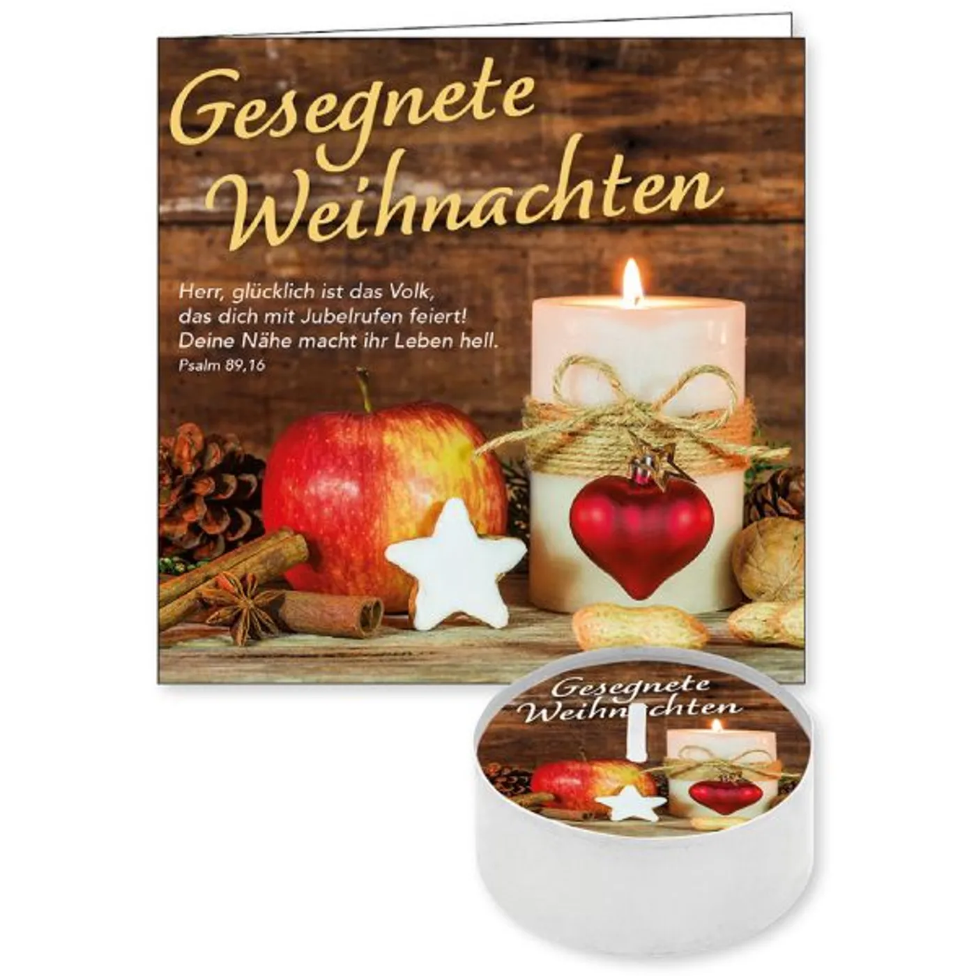 Text auf dem Teelicht: Gesegnete Weihnachten