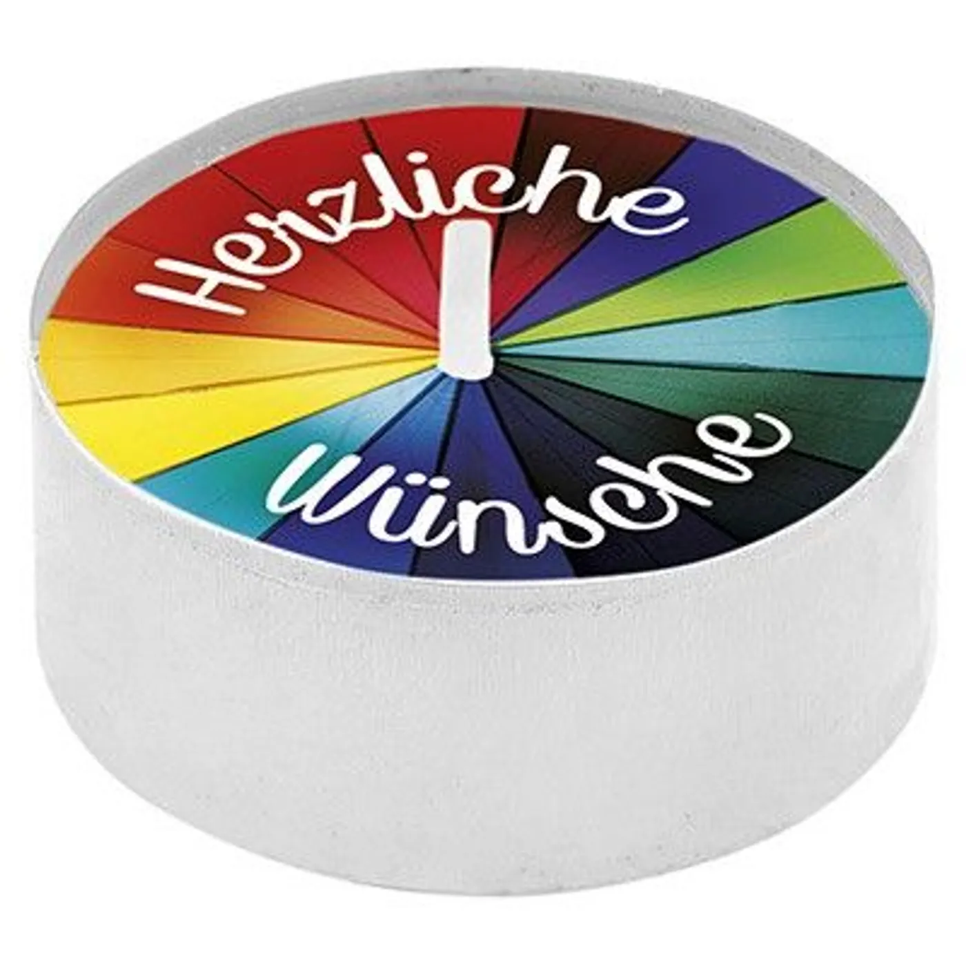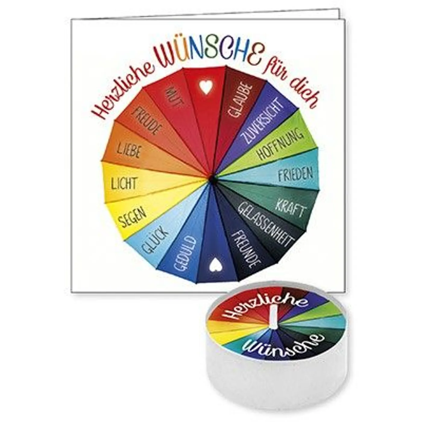 Ein kleiner Lichtgruß mit einer passenden Faltkarte. Das Teelicht ist auf besondere Weise veredelt. Beim Abbrennen schwimmt die Botschaft auf dem flüssigen Wachs und bleibt so - bis auf ein kleines Loch um die Flamme herum - sichtbar.
