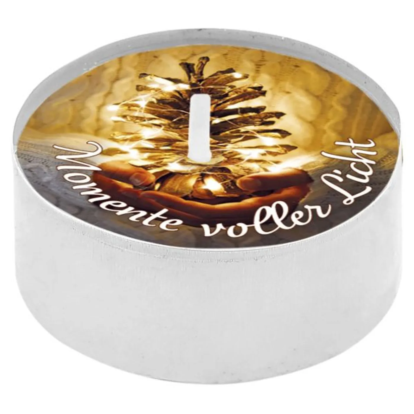 Text auf dem Teelicht: Momente voller Licht
