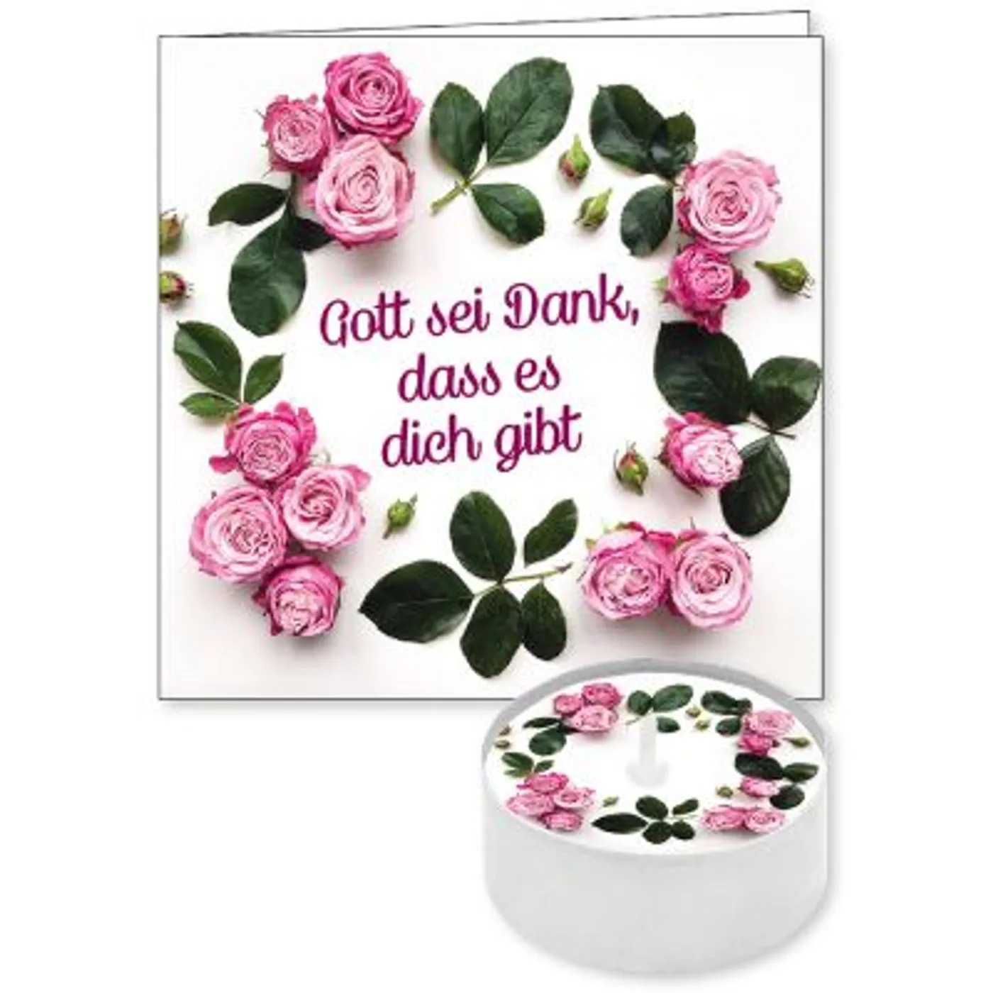 Ein kleiner Lichtgruß mit einer passenden Faltkarte. Das Teelicht ist auf besondere Weise veredelt. Beim Abbrennen schwimmt die Botschaft auf dem flüssigen Wachs und bleibt so - bis auf ein kleines Loch um die Flamme herum - sichtbar.