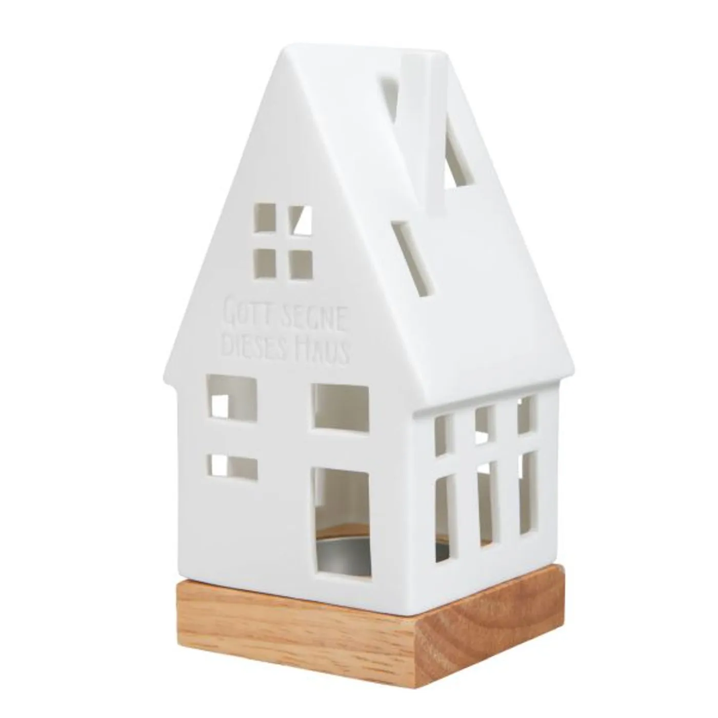 Das Lichthaus strahlt Geborgenheit und Wärme durch viele Fensteröffnungen aus, wenn im Inneren ein Teelicht (alternativ LED-Teelicht) angezündet wird. Besonders schön kommt der eingravierte Haussegen "Gott segne dieses Haus" zur Geltung.