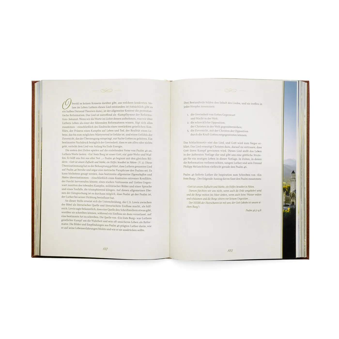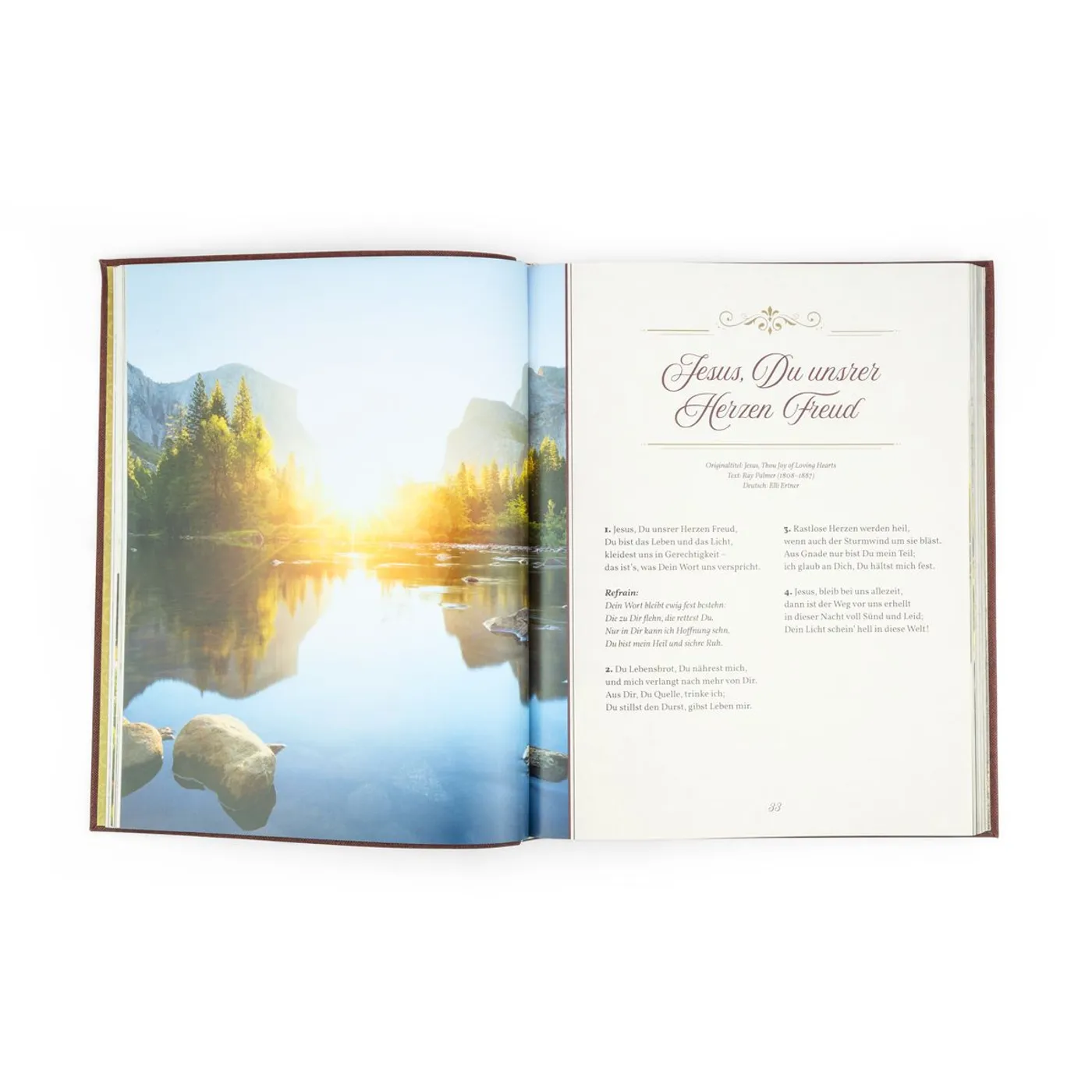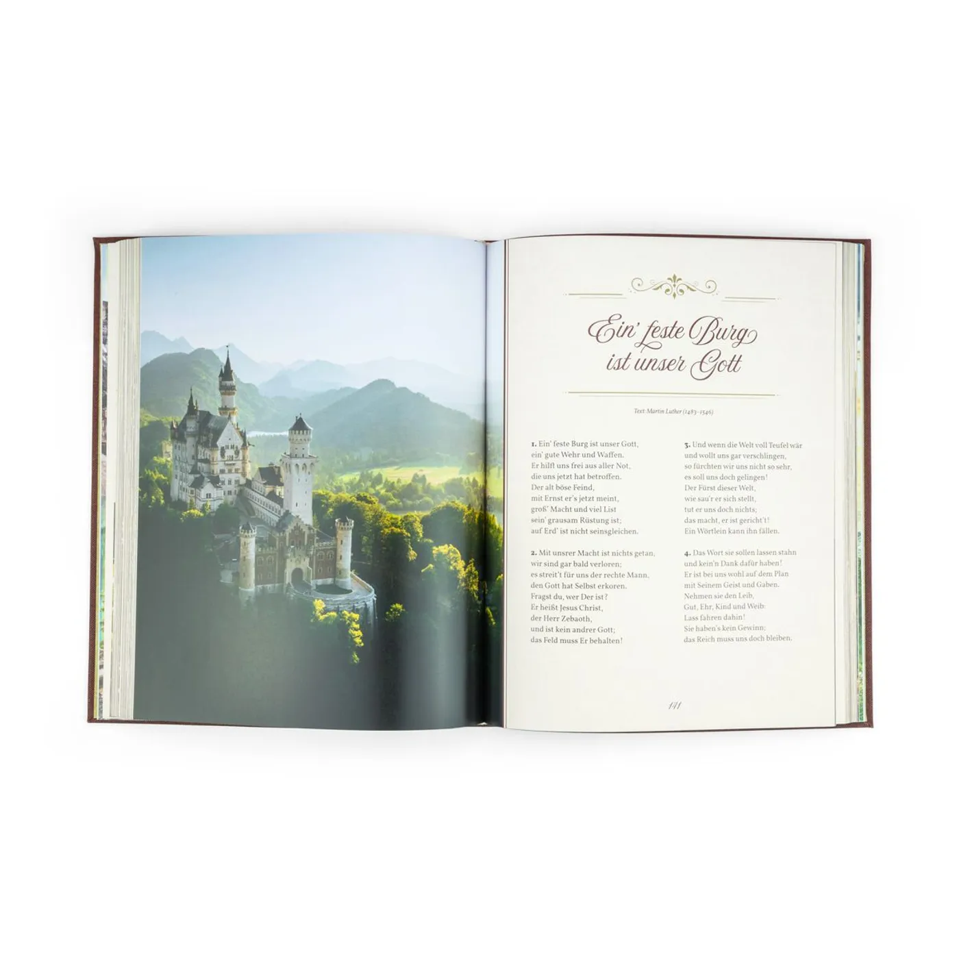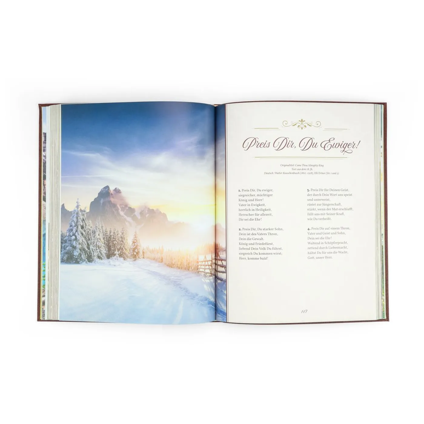 Ein wertvolles Extra sind hinzugefügte ein- bis dreistimmige Notensätze mit Akkorden, außerdem majestätische Naturbilder, auf hochwertigem Bilderdruckpapier, und ein Kunstledereinband, wodurch dieses Buch zu etwas Besonderem wird.