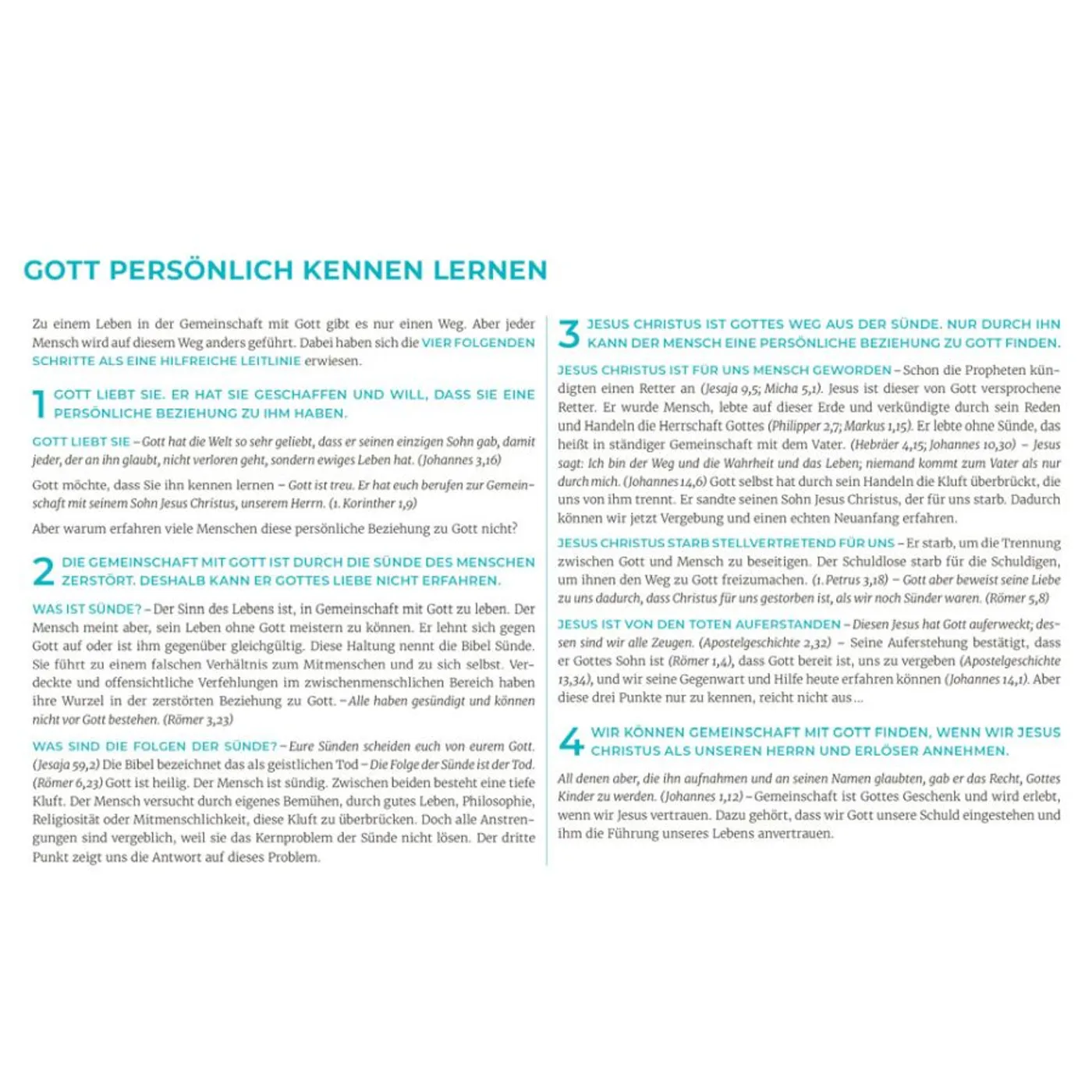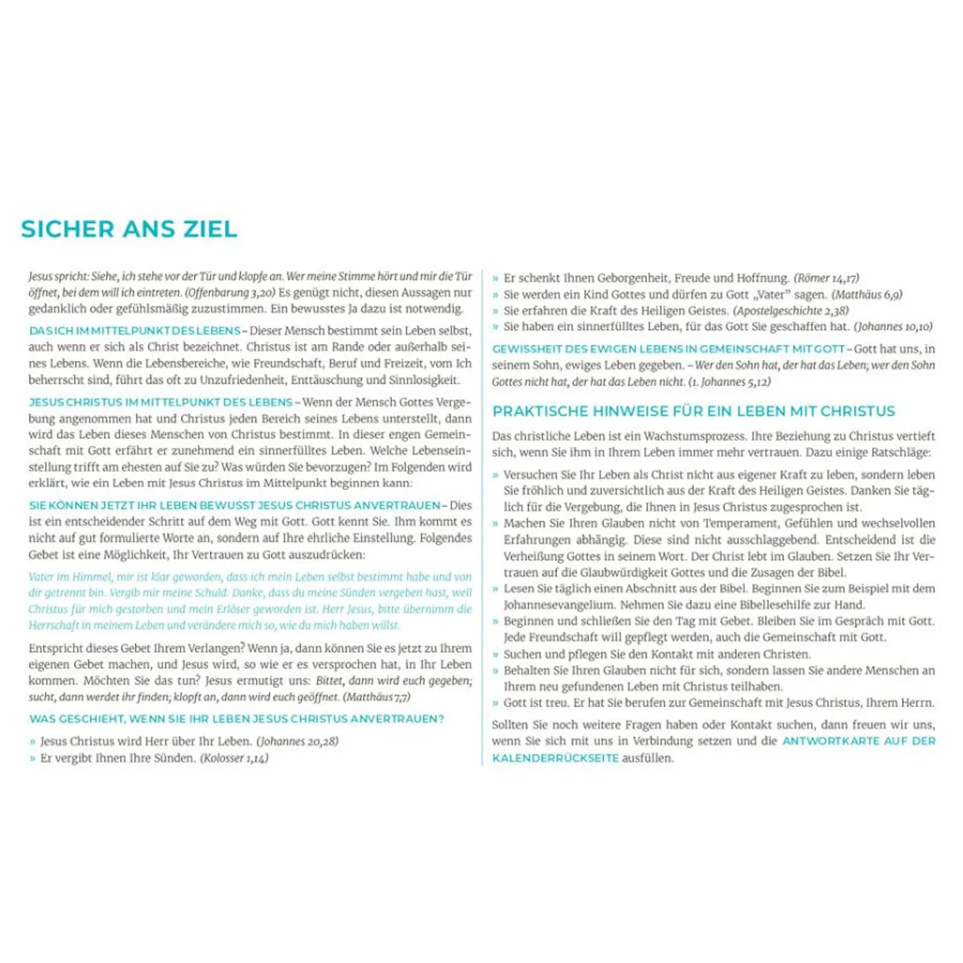 Mit Hoffnung und Mut machenden Bibelversen sowie evangelistischen Texten auf der Rückseite jedes Kalenderblattes. Am Ende des Kalenders wird erklärt, wie man eine Beziehung zu Gott bekommt. Grußkarten-Funktion der Monatsblätter durch beschreibbare Rückseite.