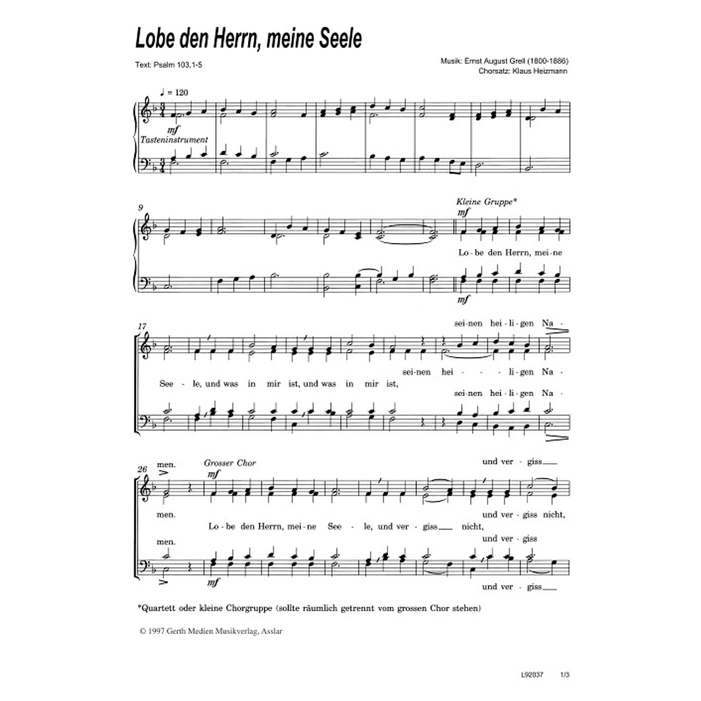 Lobe den Herrn, meine Seele (gemischter Chor, gleiche Reihe) Eduard August Grell (Komposition), Klaus Heizmann (Bearbeiter) | gemischter Chor, gleiche Reihe | 2,00 € |