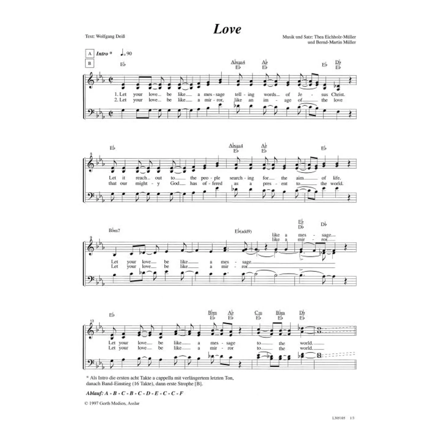 Love (diese Variante haben Sie gerade ausgewählt) (modern, Solostimme, gemischter Chor, mit Akkorden, vierstimmig, Es-Dur) Wolfgang Deiss (Text), Thea Eichholz (Komposition, Chorsatz), Bernd-Martin Müller (Komposition, Chorsatz) |