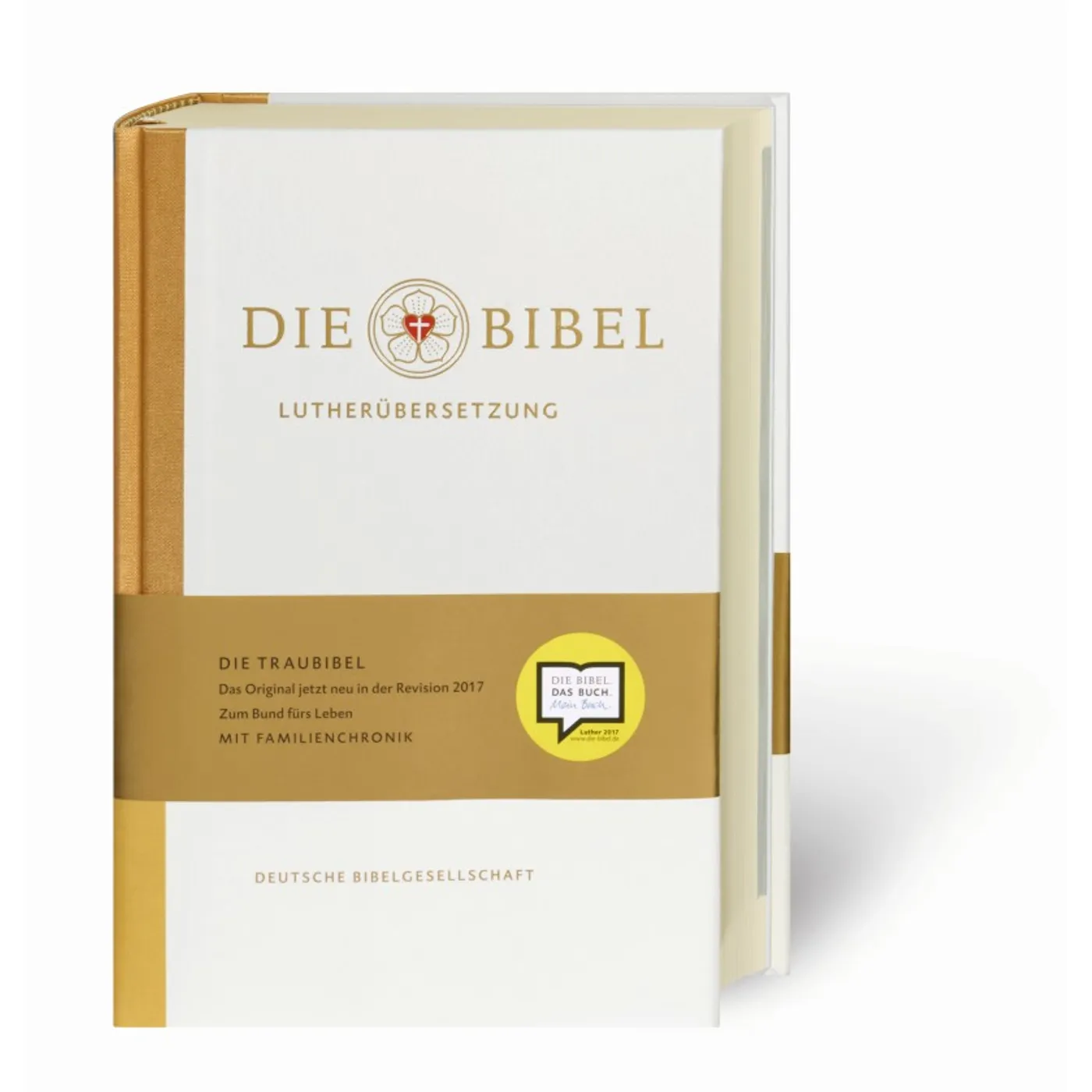 Wenn zwei Menschen sich vor Gott das Ja-Wort geben, gehört diese wunderschöne Ausgabe unbedingt dazu. Der Einband ist in hochzeitlichem Weiß und Gold gestaltet, zwei Lesebändchen in einem Buch verheißen gemeinsame Lektüre mit unterschiedlichen Schwerpunkten. Die Familienchronik ist dafür vorbereitet, das künftige Familienleben widerzuspiegeln – wenn Kinder und Enkelkinder mit ihrer eigenen Geschichte dazukommen. Mit farbigen Landkarten im Vor- und Nachsatz.