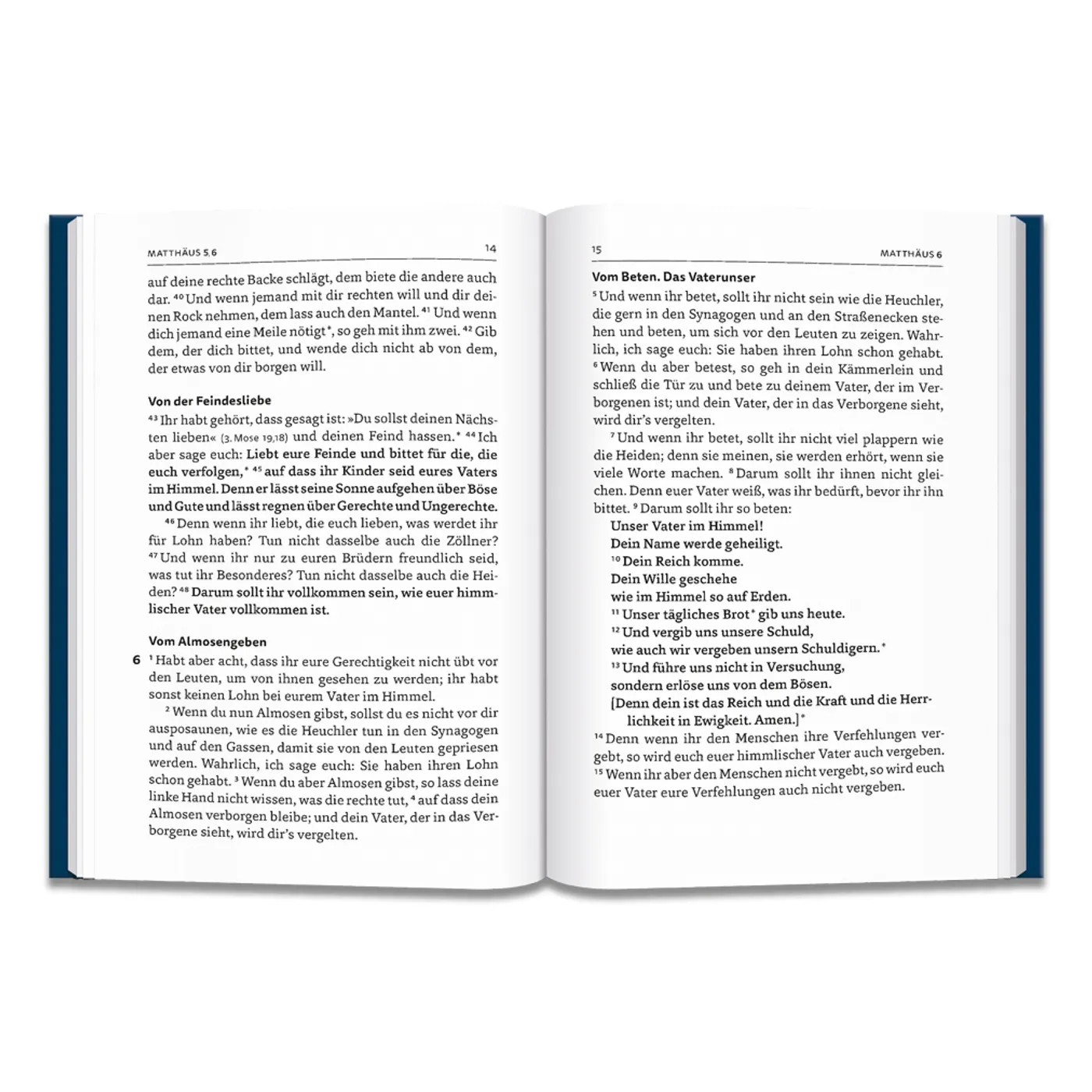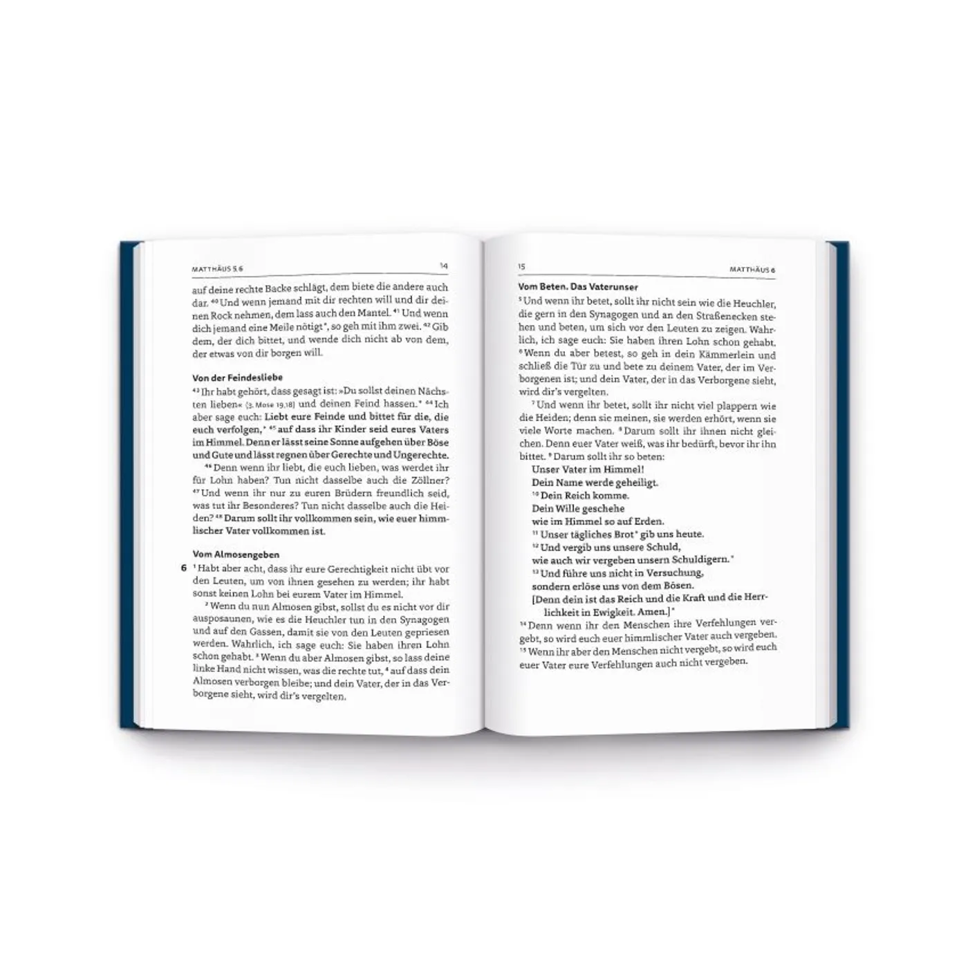 Für diese Großdruckausgabe wurde eine besonders klare und gut leserliche Schrift in der Schriftgröße 14 Punkt gewählt. Durch den einspaltigen Satz und den sehr übersichtlichen Seitenaufbau ist eine leichte Orientierung möglich. Gleichzeitig wurde darauf geachtet, dass der Charakter einer »echten« Bibel nicht verloren geht. So sind beispielsweise auch in dieser Ausgabe die Kernstellen fett gedruckt.
