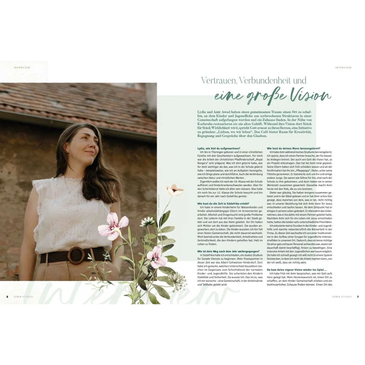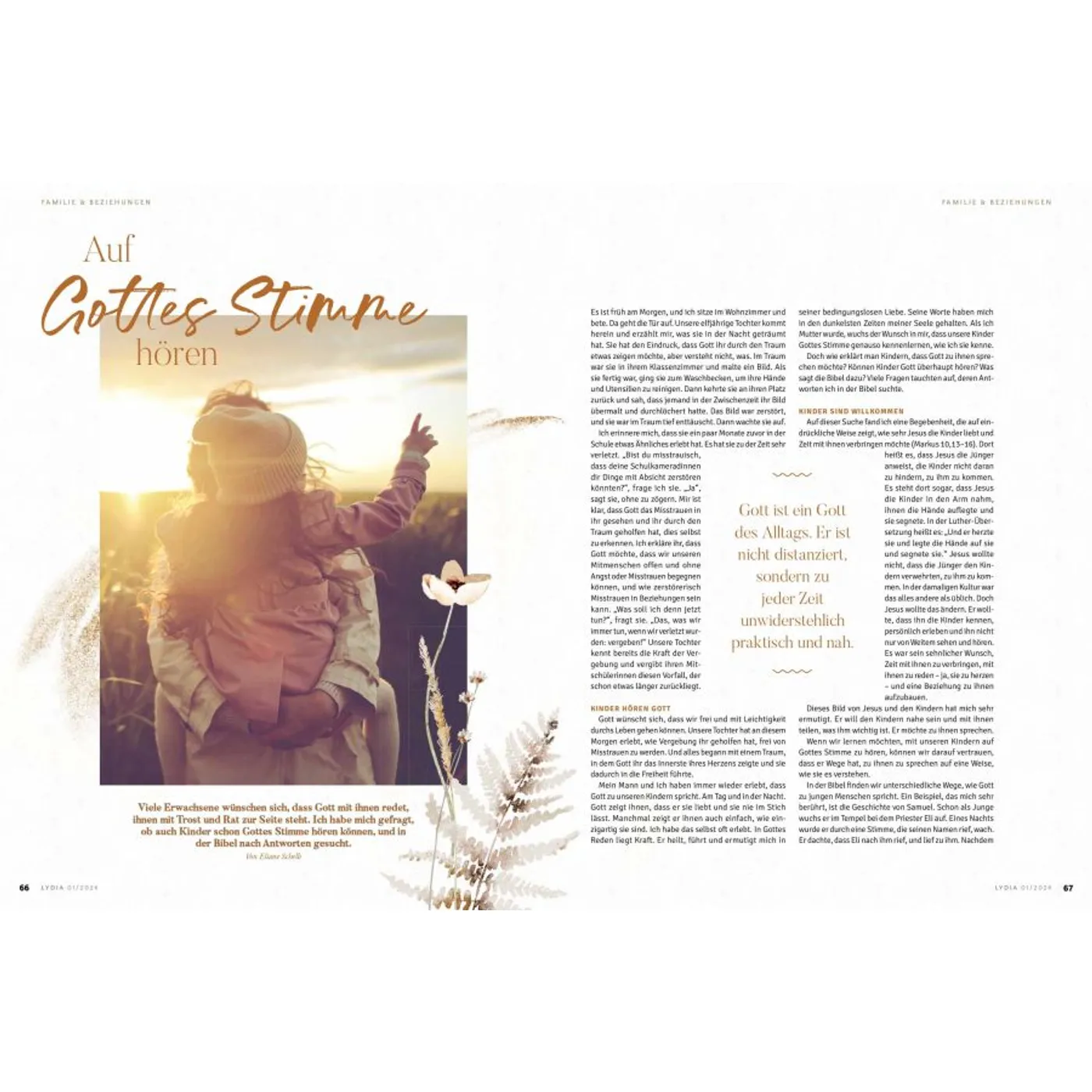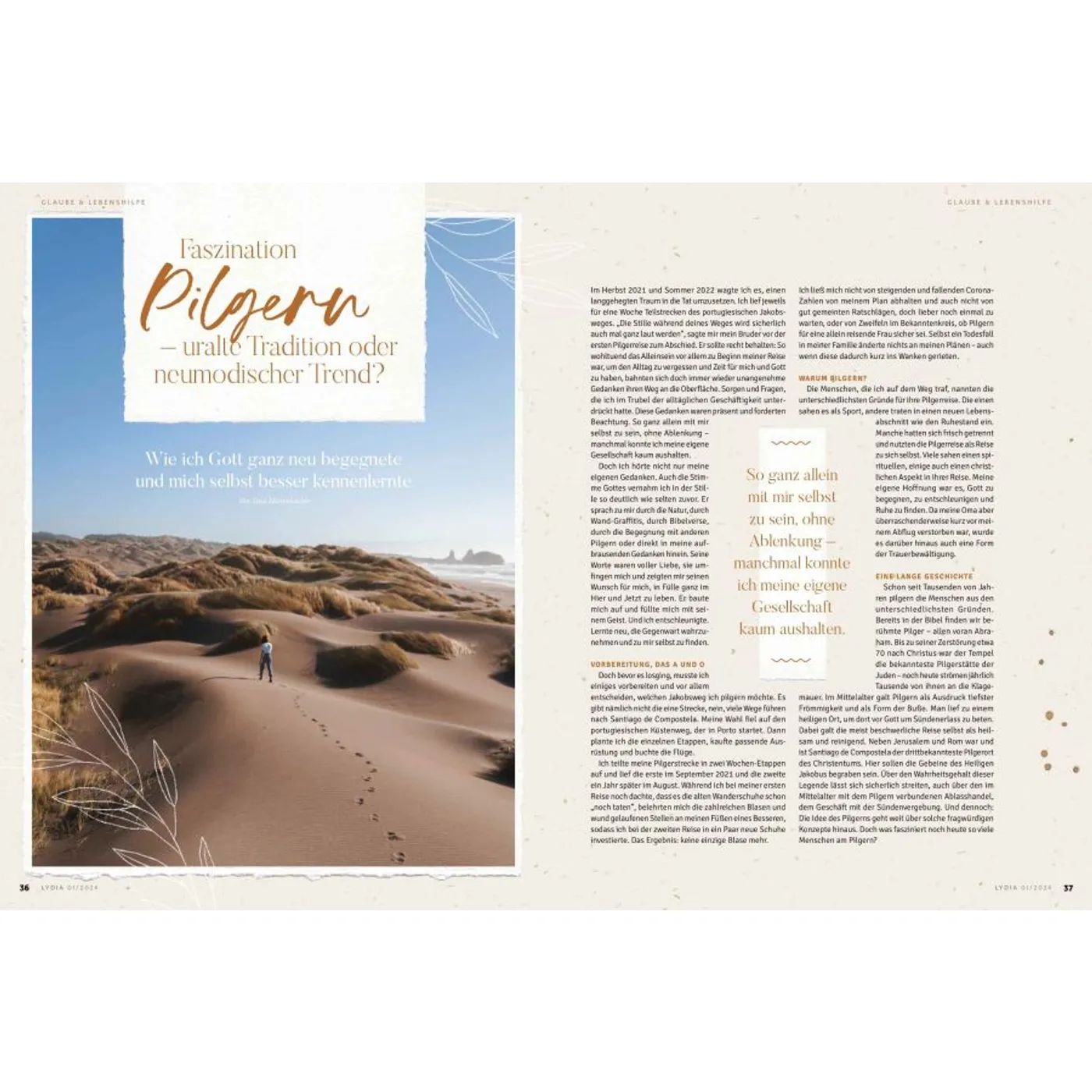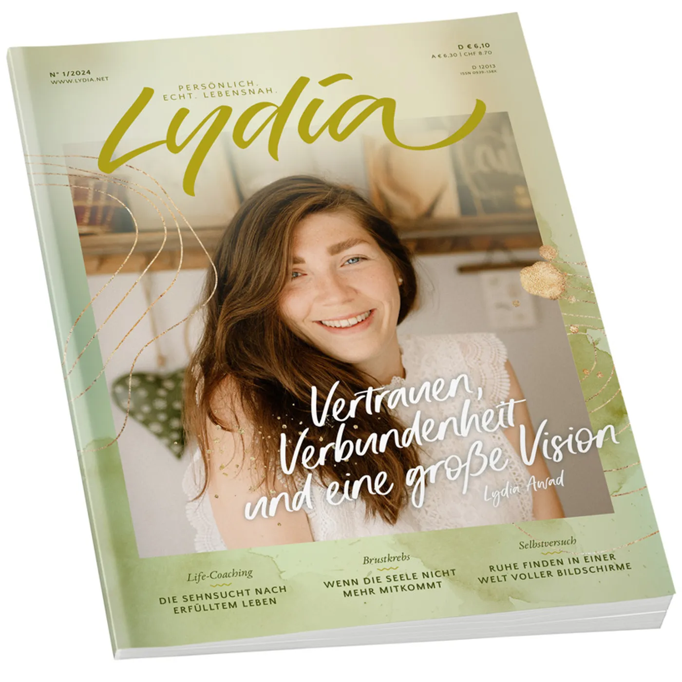 Lydia lädt Frauen ein, das Leben zu teilen und miteinander unterwegs zu sein. In den schönen Momenten aber auch in Zeiten der Angst und Sorge weist sie auf den hin, der Hoffnung und Sinn gibt: Jesus. Die Zeitschrift begleitet und ermutigt Frauen in den verschiedenen Lebensphasen – über die Grenzen von Konfessionen und Generationen hinweg. Auf dieser Plattform können Frauen voneinander lernen und sich gegenseitig beraten, egal ob Single, junge Mutter, Berufstätige oder Seniorin. Durch persönliche Erfahrungsberichte und Ratgeberartikel erleben die Leserinnen Gottes Handschrift ganz nahbar und bekommen wertvolle Impulse für den Alltag. Lydia bietet 4 x im Jahr: • Ermutigung im Glauben & Lebenshilfe durch den Austausch mit anderen Frauen • Geistliche Impulse, die Körper & Seele stärken • Ehrliche Einblicke, wie Familie & Beziehungen gelebt werden können • Inspirierende Berichte, wie Frauen in Beruf & Gesellschaft einen Unterschied machen