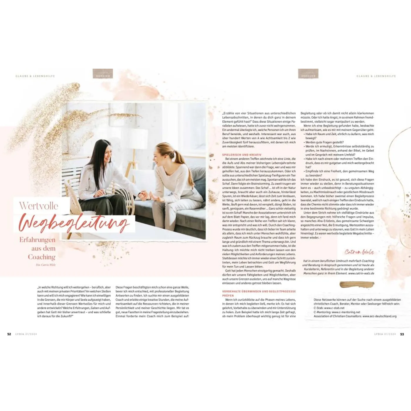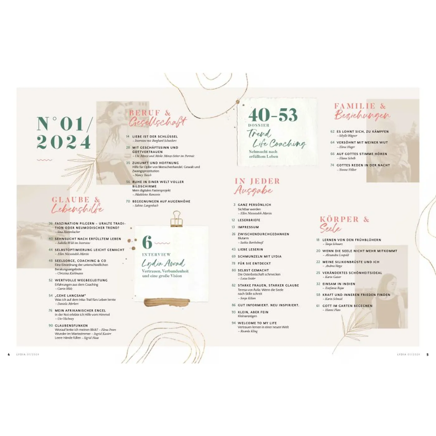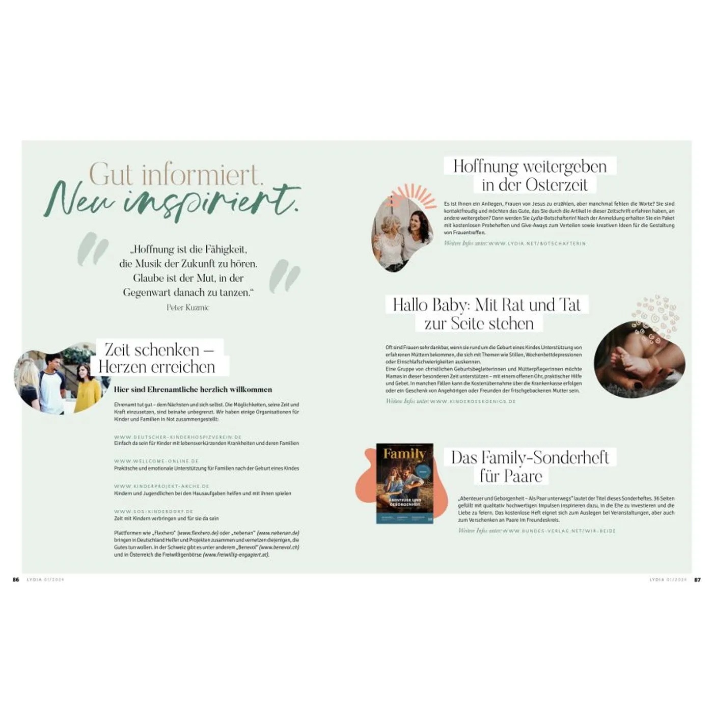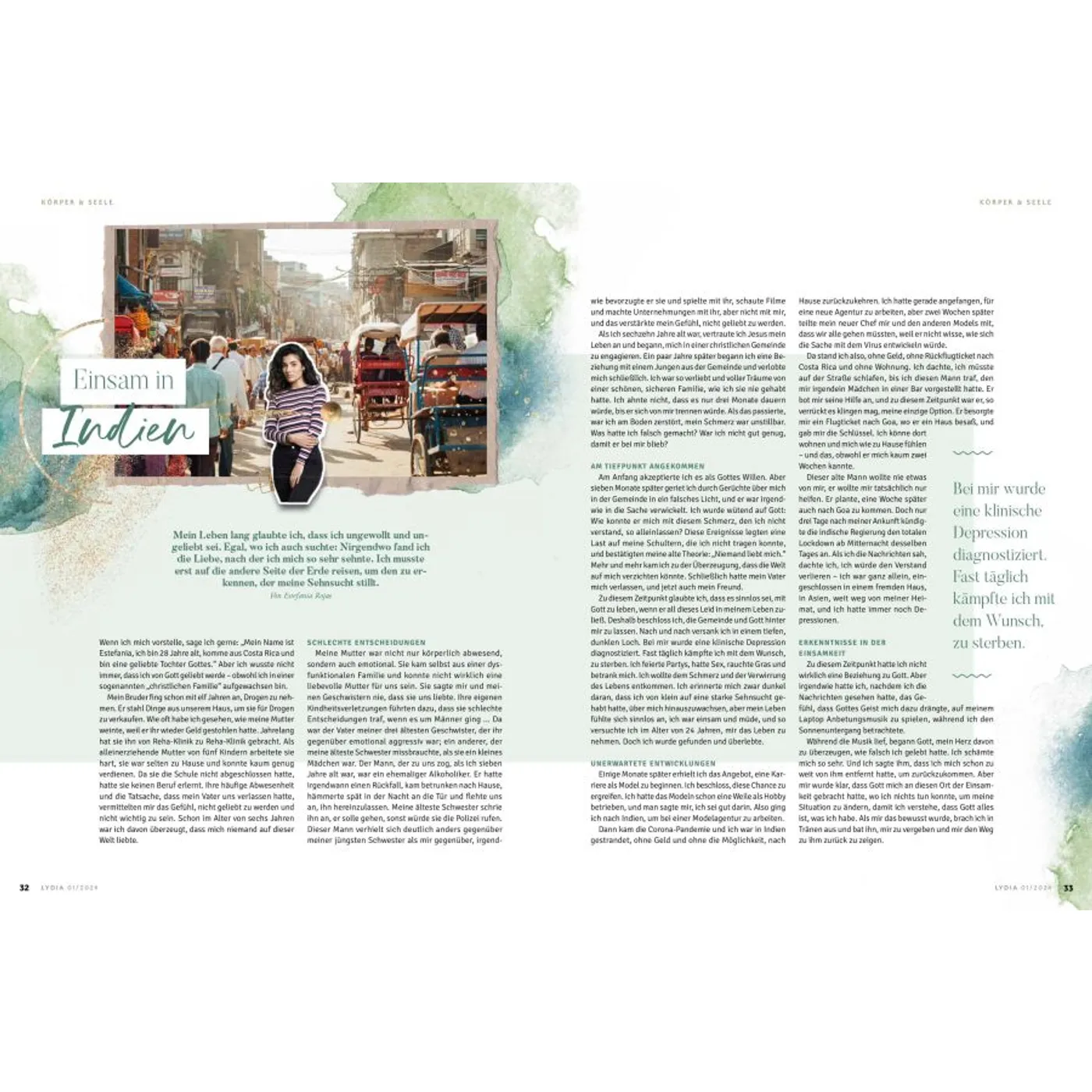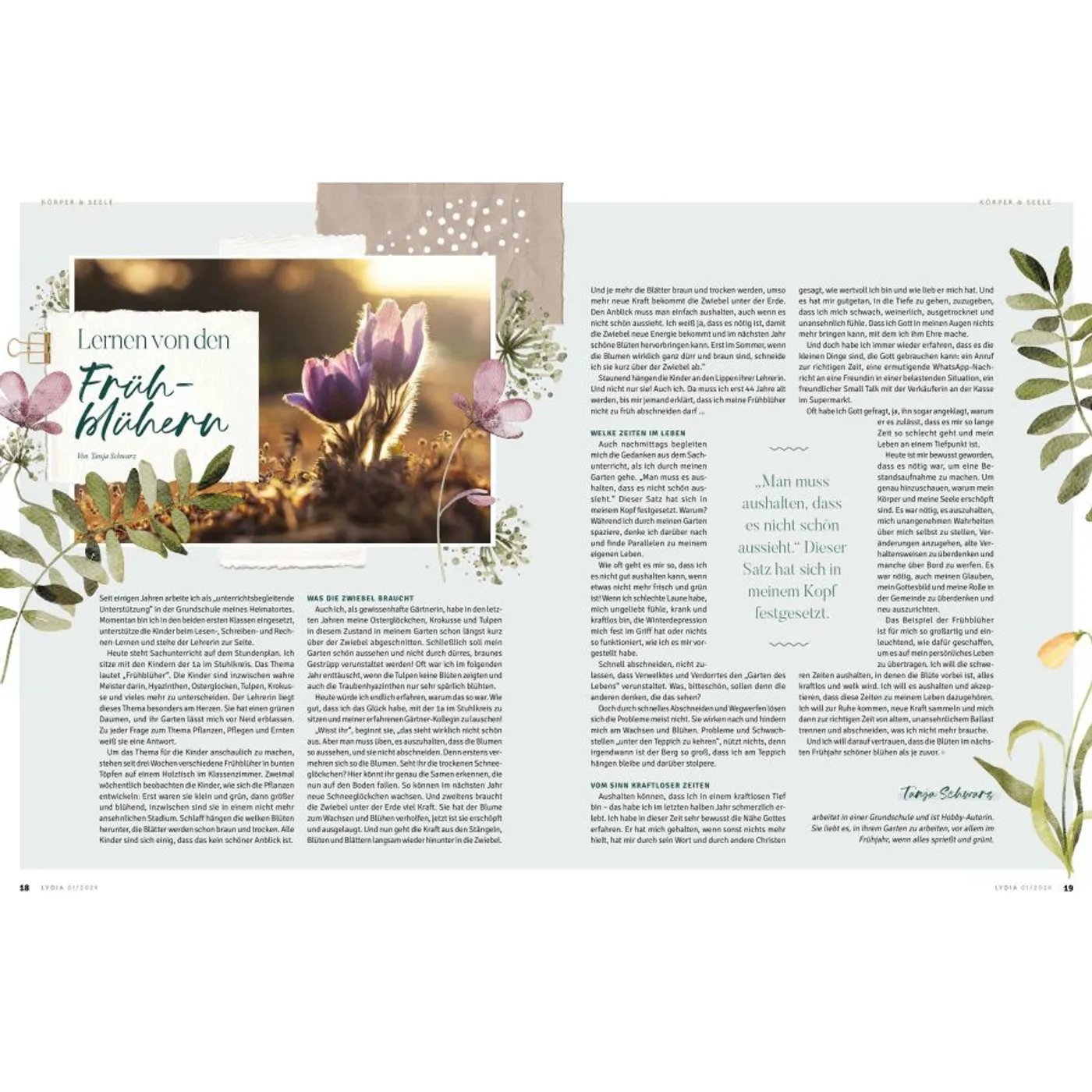 Lydia lädt Frauen ein, das Leben zu teilen und miteinander unterwegs zu sein. In den schönen Momenten aber auch in Zeiten der Angst und Sorge weist sie auf den hin, der Hoffnung und Sinn gibt: Jesus. Die Zeitschrift begleitet und ermutigt Frauen in den verschiedenen Lebensphasen – über die Grenzen von Konfessionen und Generationen hinweg. Auf dieser Plattform können Frauen voneinander lernen und sich gegenseitig beraten, egal ob Single, junge Mutter, Berufstätige oder Seniorin. Durch persönliche Erfahrungsberichte und Ratgeberartikel erleben die Leserinnen Gottes Handschrift ganz nahbar und bekommen wertvolle Impulse für den Alltag. Lydia bietet 4 x im Jahr: • Ermutigung im Glauben & Lebenshilfe durch den Austausch mit anderen Frauen • Geistliche Impulse, die Körper & Seele stärken • Ehrliche Einblicke, wie Familie & Beziehungen gelebt werden können • Inspirierende Berichte, wie Frauen in Beruf & Gesellschaft einen Unterschied machen