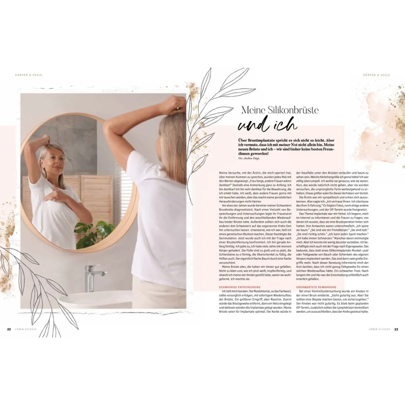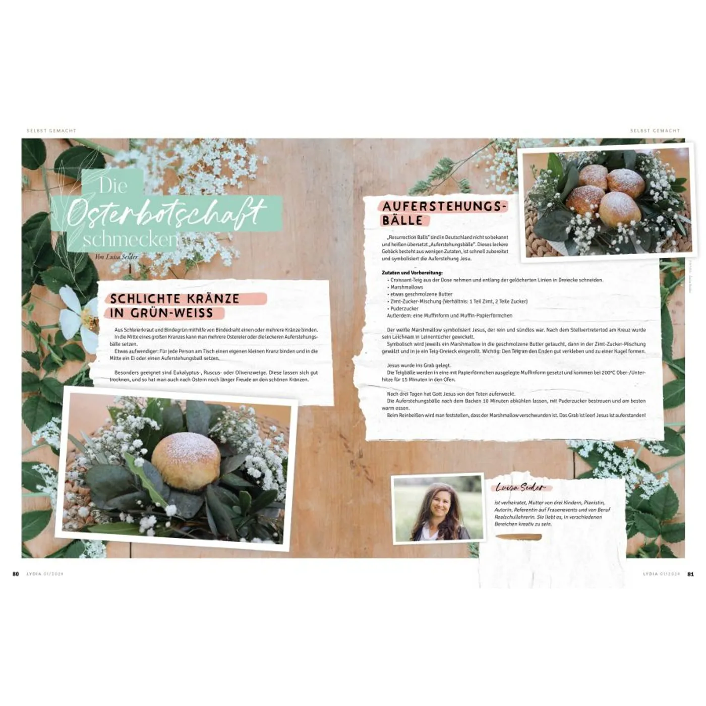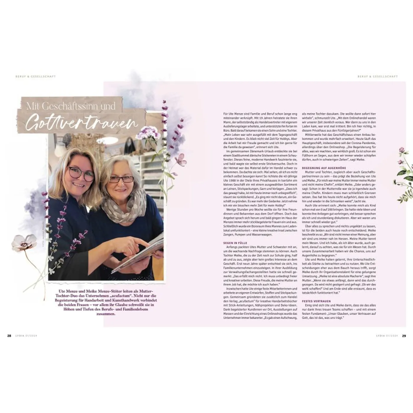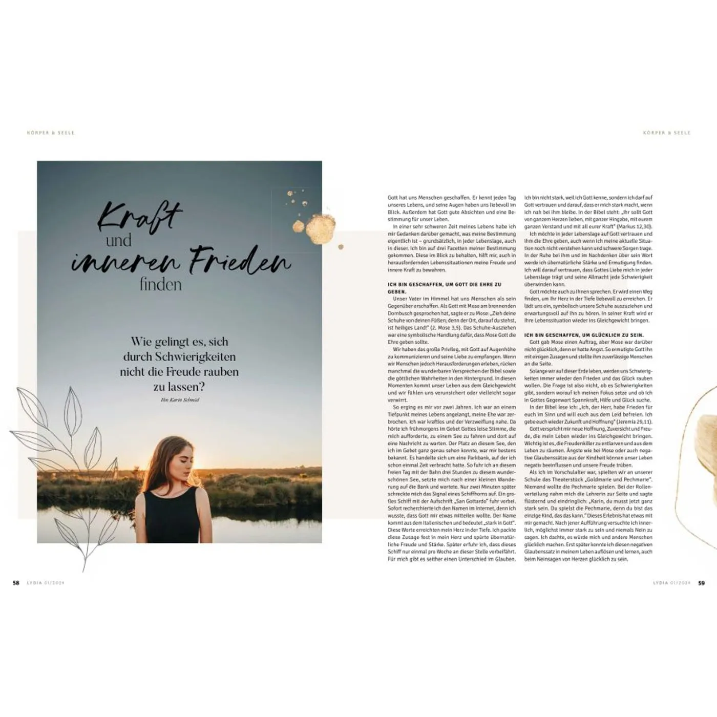 Lydia lädt Frauen ein, das Leben zu teilen und miteinander unterwegs zu sein. In den schönen Momenten aber auch in Zeiten der Angst und Sorge weist sie auf den hin, der Hoffnung und Sinn gibt: Jesus. Die Zeitschrift begleitet und ermutigt Frauen in den verschiedenen Lebensphasen – über die Grenzen von Konfessionen und Generationen hinweg. Auf dieser Plattform können Frauen voneinander lernen und sich gegenseitig beraten, egal ob Single, junge Mutter, Berufstätige oder Seniorin. Durch persönliche Erfahrungsberichte und Ratgeberartikel erleben die Leserinnen Gottes Handschrift ganz nahbar und bekommen wertvolle Impulse für den Alltag. Lydia bietet 4 x im Jahr: • Ermutigung im Glauben & Lebenshilfe durch den Austausch mit anderen Frauen • Geistliche Impulse, die Körper & Seele stärken • Ehrliche Einblicke, wie Familie & Beziehungen gelebt werden können • Inspirierende Berichte, wie Frauen in Beruf & Gesellschaft einen Unterschied machen
