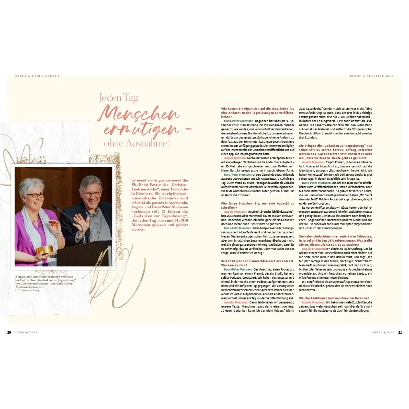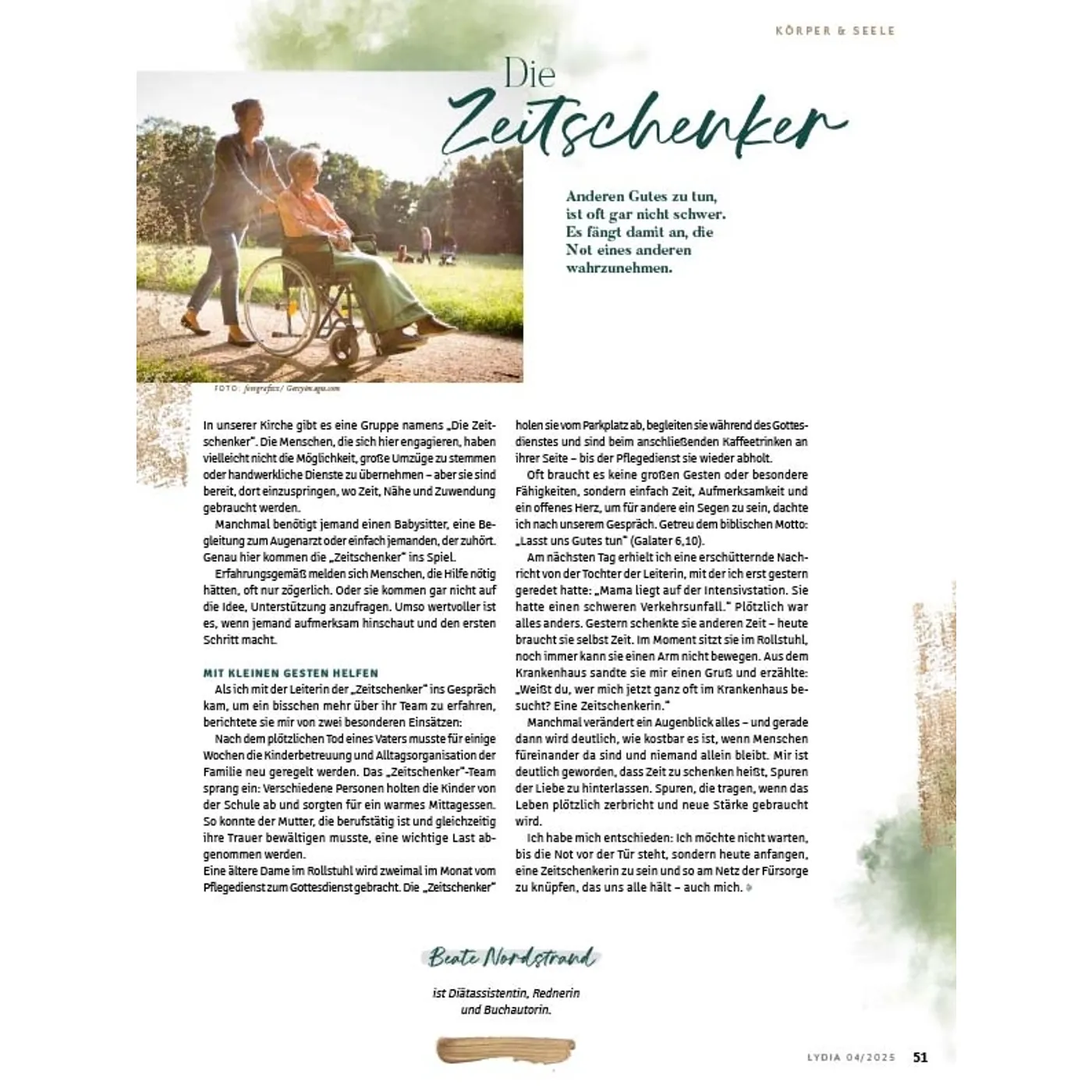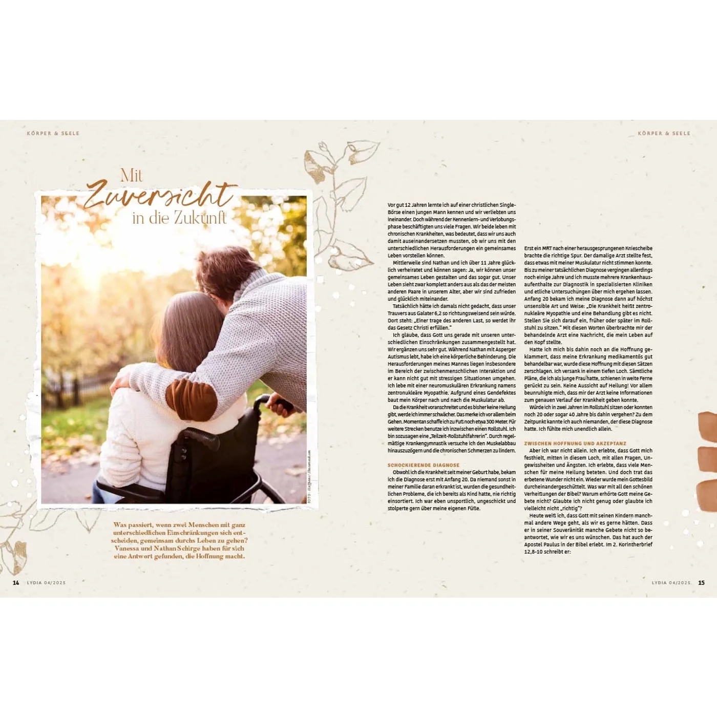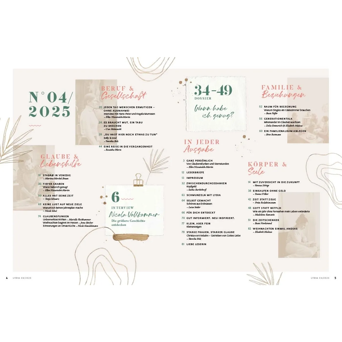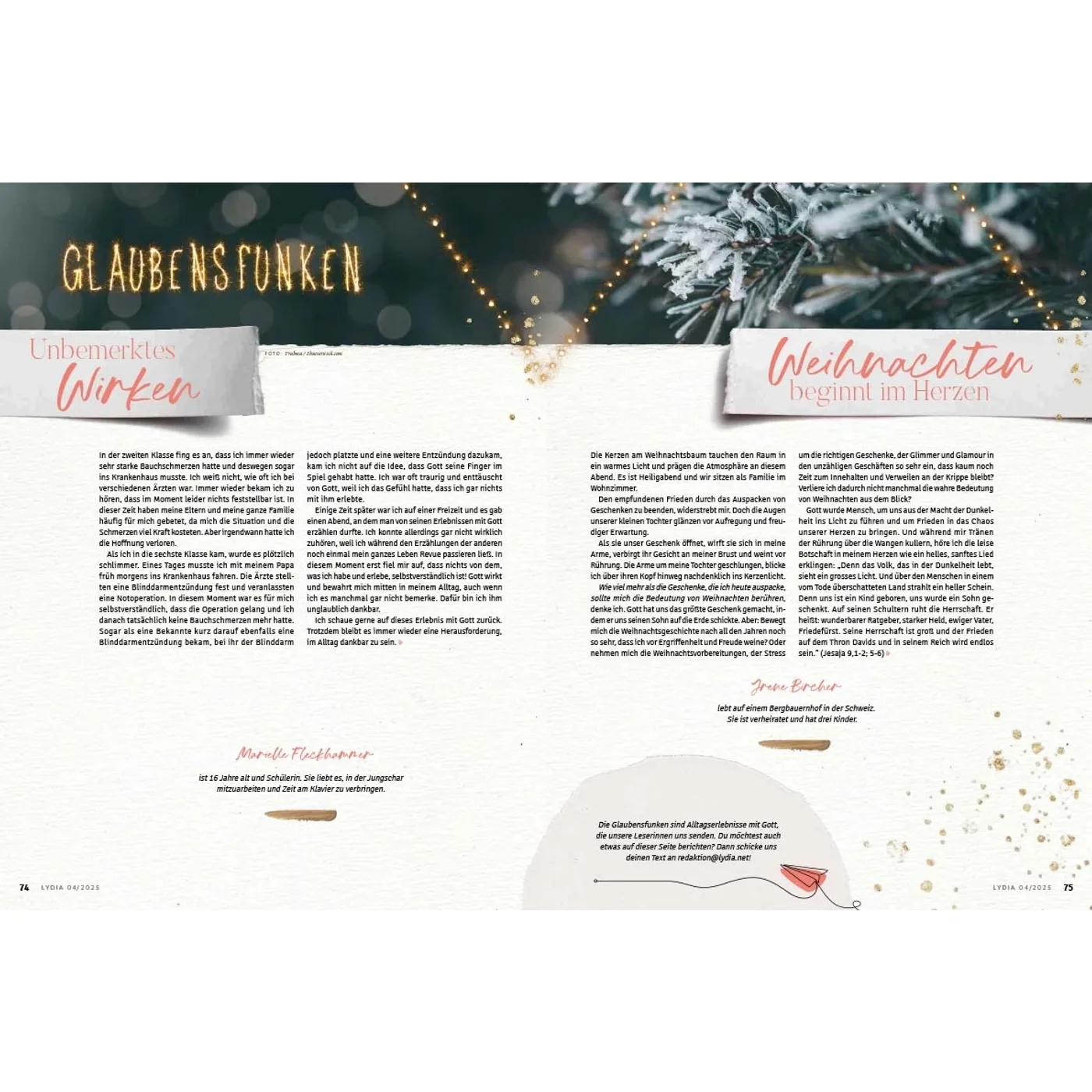 Lydia lädt Frauen ein, das Leben zu teilen und miteinander unterwegs zu sein. In den schönen Momenten aber auch in Zeiten der Angst und Sorge weist sie auf den hin, der Hoffnung und Sinn gibt: Jesus. Die Zeitschrift begleitet und ermutigt Frauen in den verschiedenen Lebensphasen – über die Grenzen von Konfessionen und Generationen hinweg. Auf dieser Plattform können Frauen voneinander lernen und sich gegenseitig beraten, egal ob Single, junge Mutter, Berufstätige oder Seniorin. Durch persönliche Erfahrungsberichte und Ratgeberartikel erleben die Leserinnen Gottes Handschrift ganz nahbar und bekommen wertvolle Impulse für den Alltag. Lydia bietet 4 x im Jahr: • Ermutigung im Glauben & Lebenshilfe durch den Austausch mit anderen Frauen • Geistliche Impulse, die Körper & Seele stärken • Ehrliche Einblicke, wie Familie & Beziehungen gelebt werden können • Inspirierende Berichte, wie Frauen in Beruf & Gesellschaft einen Unterschied machen Was Lydia-Leserinnen sagen: „Ich finde es so wunderbar, dass in Lydia mutige Frauen ihre Geschichte teilen und mir die Möglichkeit geben, ganz echt, nahbar und tief in ihr Leben hineinzuschauen. Lydia schafft es, eine große Breite an Themen aufzustellen und diese mit so wertvollem Input zu füllen. Für jede ist etwas dabei!“ Ronja Aselmann Egal, ob zum Muttertag, zu Weihnachten, zum Geburtstag, als Dankeschön oder einfach nur so: Ein Lydia-Abo ist eine wertvolle Geschenkidee für die beste Freundin, Schwester, Mutter, Tochter oder andere Wegbegleiterinnen. Als Lydia-Botschafterin können Sie Hefte weitergeben, um mithilfe der Zeitschrift anderen Frauen von Jesus zu erzählen.