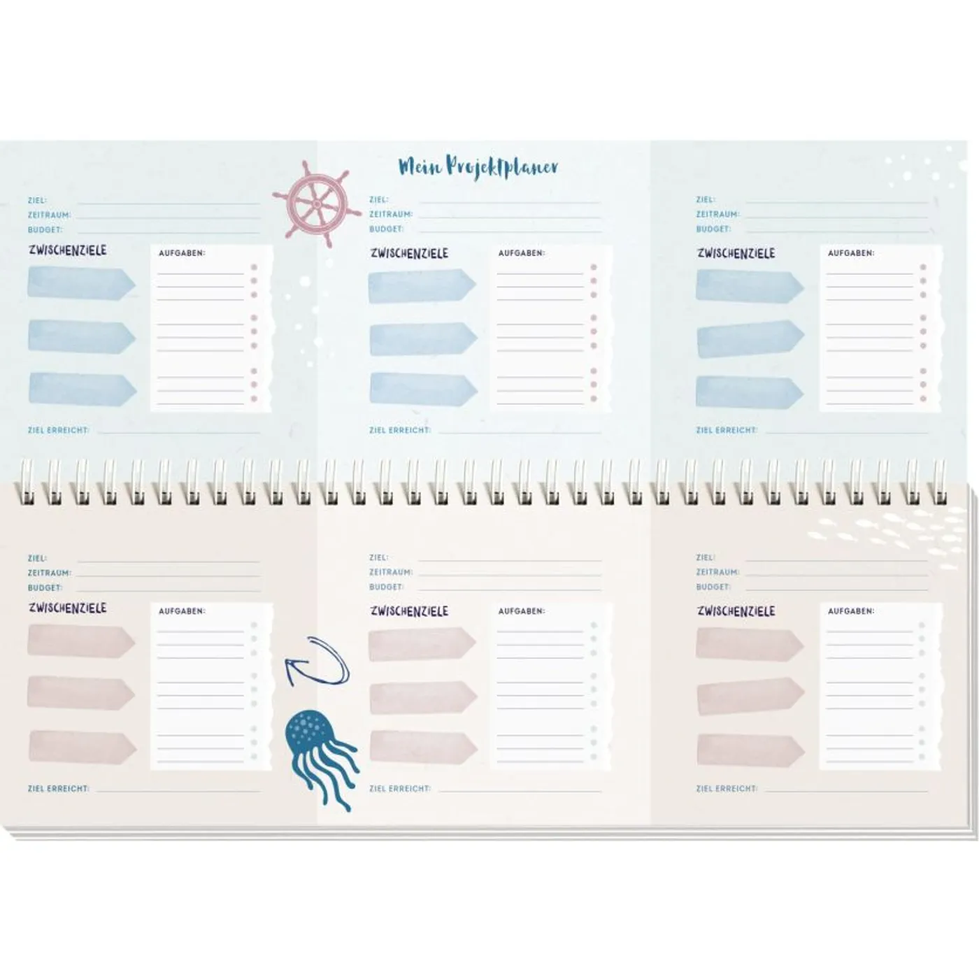 Neben Sprüchen, die die Meer-Sehnsucht stillen, bietet der Planer viele praktische Elemente: Jahres- und Monatsübersichten, 2-seitige Wochenübersichten mit viel Platz für Notizen und Termine, nützliche Tools wie To-do-Listen, Habit-Tracker oder Geburtstagserinnerung. Dank Extra-Seiten für Projekte- und Urlaubsplanung fürs Jahr 2026 kannst du Ziele Schritt für Schritt erreichen und dabei eine gesunde Work-Life-Balance bewahren.