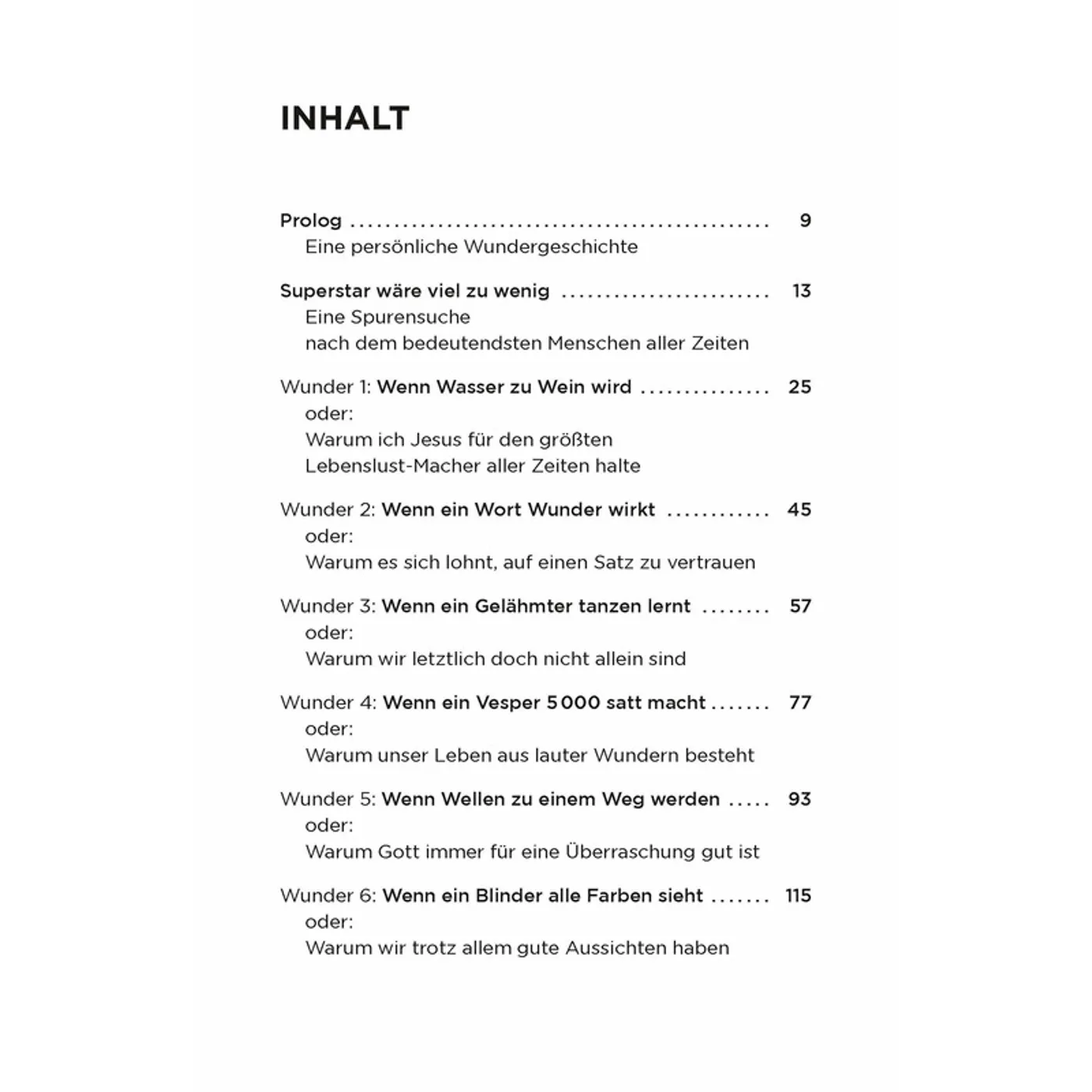 Die ersten Kapitel sind alle gleich aufgebaut: Zuerst der kursiv gedruckte Bibeltext mit der Originalversion der Wundererzählung. Dann folgt eine detailreiche vertiefte Erzählung des Autors und seine Gedanken und Auslegungen dazu. Immer wieder fordern Fragen, Checks und Impulse den Leser ganz persönlich heraus. Abgeschlossen wird das Kapitel durch einen Text in Gedichtform. Im zweiten Teil des Buches geht der Autor auf das Wunder vom Kreuz und das Wunder von Ostern ein, was ebenfalls im Johannesevangelium beschrieben wird. Da ändert sich der Stil des Buches etwas, es geht nicht mehr um ein einzelnes Erlebnis, sondern öffnet den Blick auf den ganzen Heilsplan und erklärt anschaulich, was es damit auf sich hat. Am Schluss des Buches geht Steffen Kern auf die 25 grössten Wunder dieser Welt ein und will damit aufzeigen, dass wir tagtäglich von Wundern umgeben sind, auch wenn sie auf den ersten Blick vielleicht nicht immer so spektakulär sind. Vorkenntnisse sind keine notwendig. Das Buch ist für alle geeignet, die sich für Jesus und seine Wunder interessieren. Packend geschrieben, lässt sich das Buch leicht und flüssig lesen.