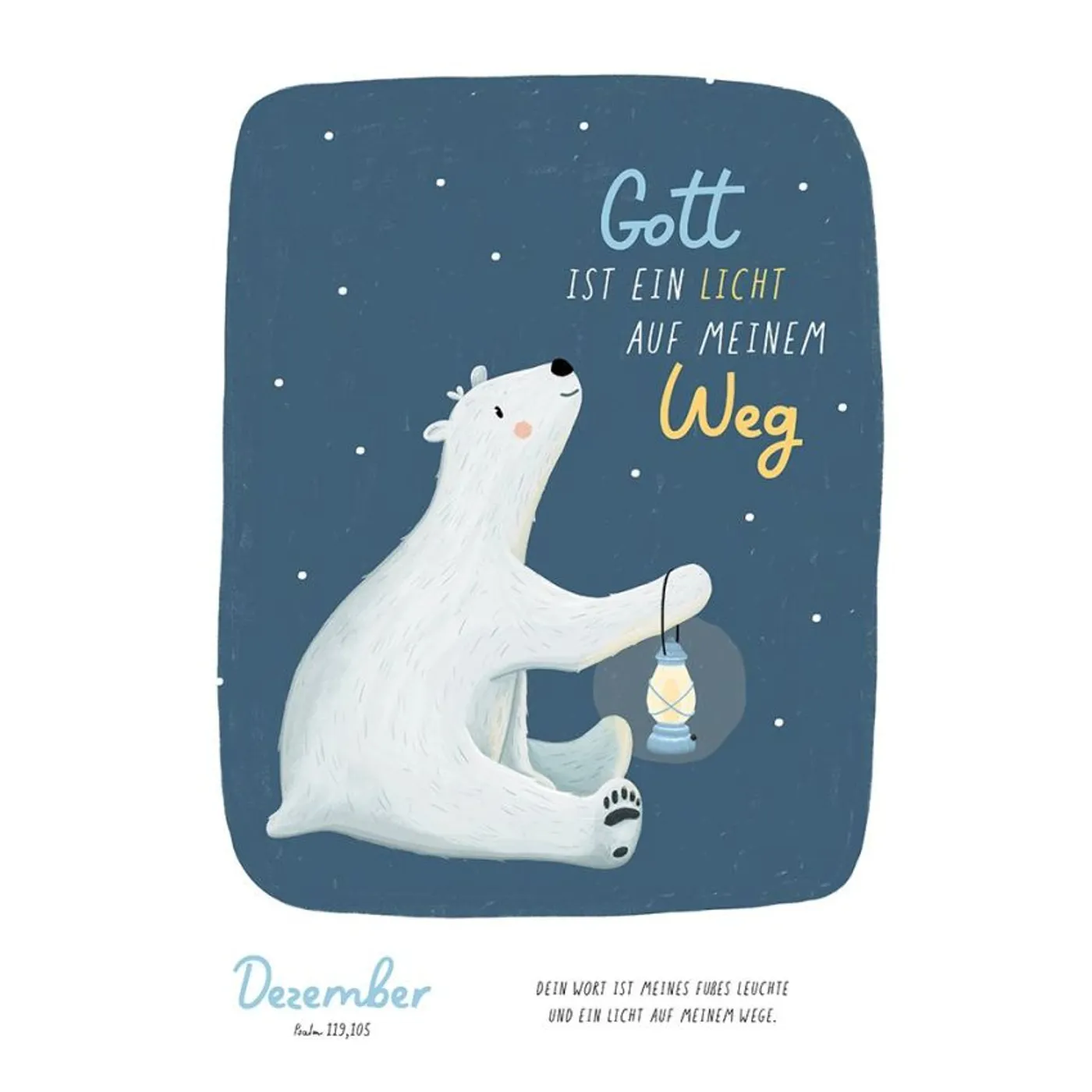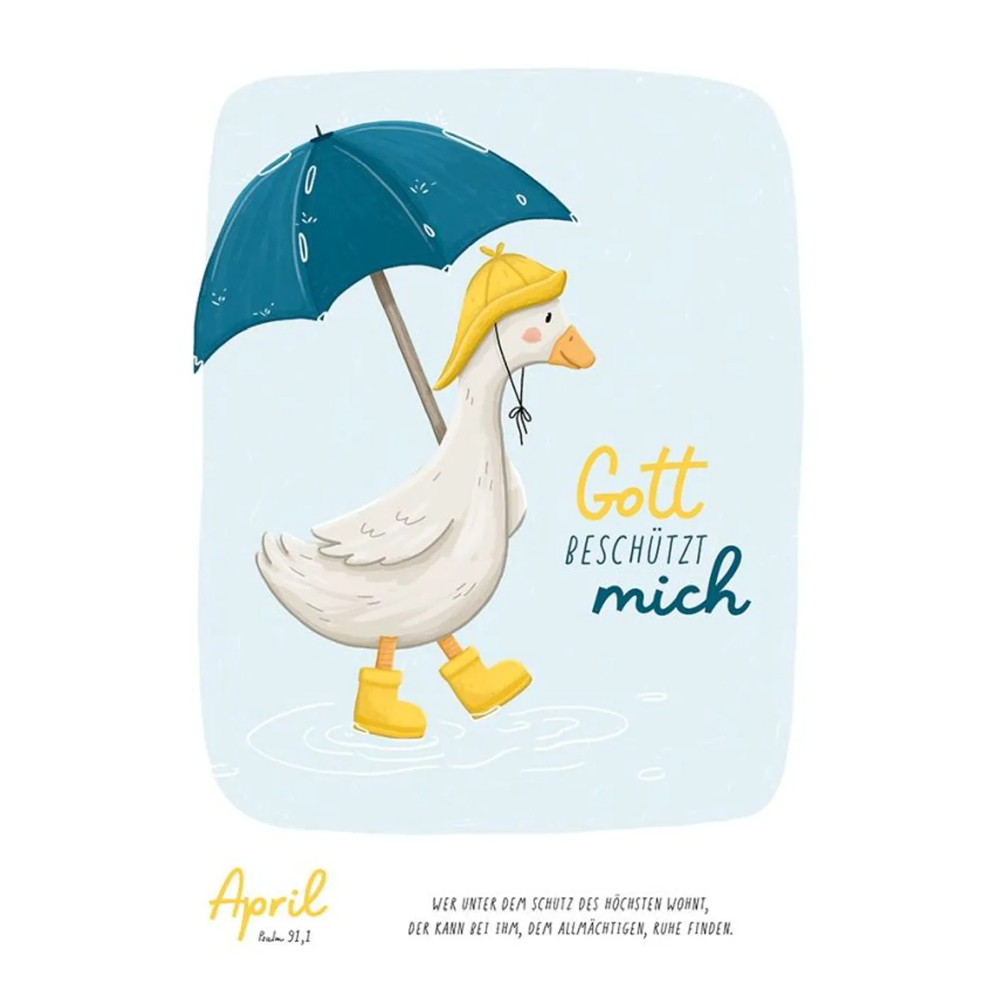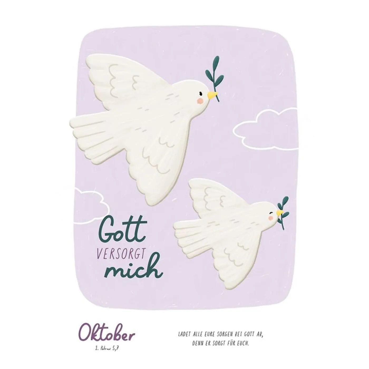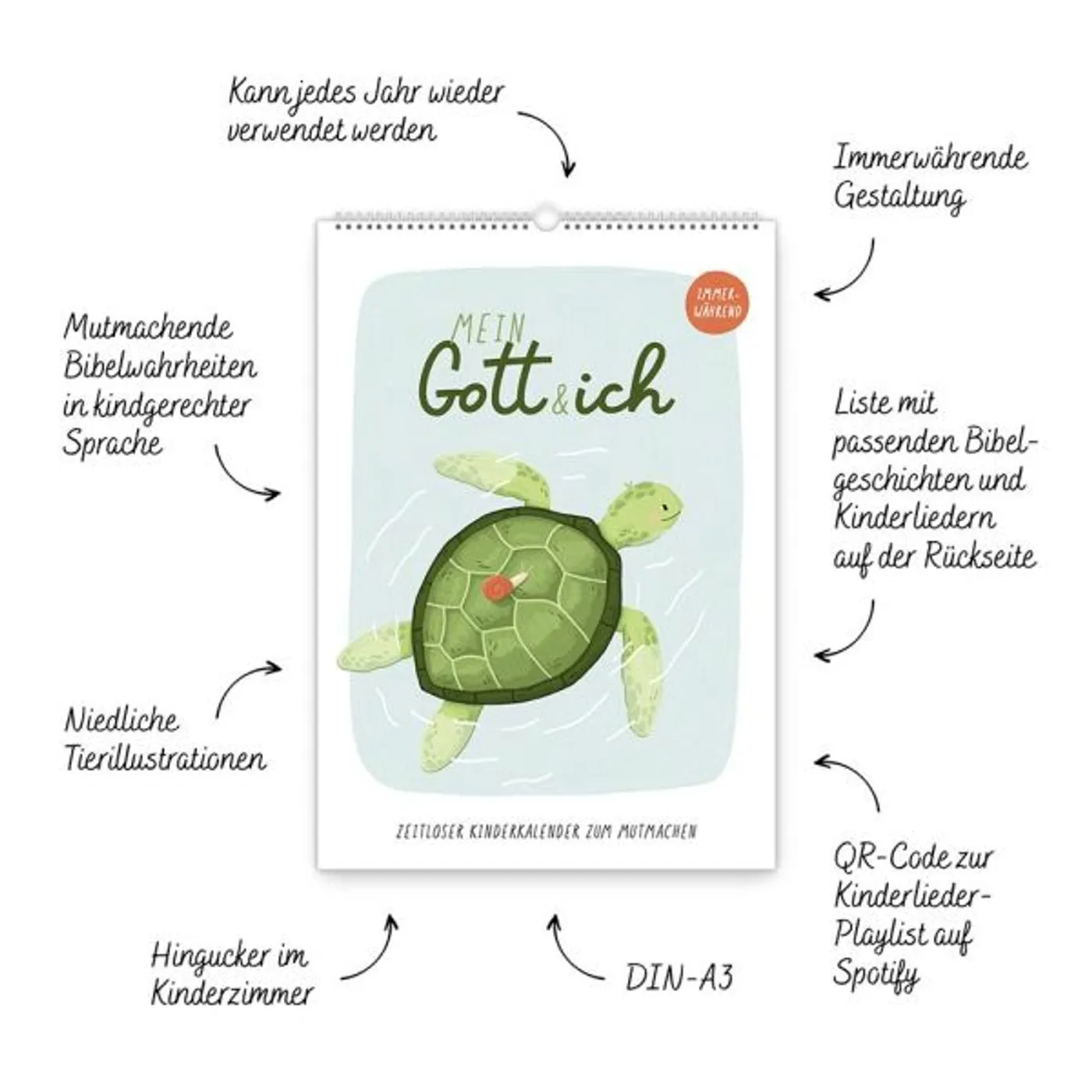 Der immerwährende Kalender „Mein Gott und ich“ ist eine liebevoll gestaltete und rundum durchdachte Möglichkeit, Kinder im Alltag mit Gottes Zusagen zu begleiten. Jeder Monat bietet einen ermutigenden Spruch mit passendem Bibelvers, der Kindern Mut macht und sie daran erinnert: Gott sieht mich, liebt mich und ist bei mir. Besonders schön finde ich die Ergänzung am Ende des Kalenders – dort sind zu jedem Monat passende biblische Geschichten und Kinderlieder vermerkt, sogar mit QR-Code zu einer Playlist. So wird der Kalender zu einem echten Begleiter durchs Jahr, der Herz und Sinne anspricht.