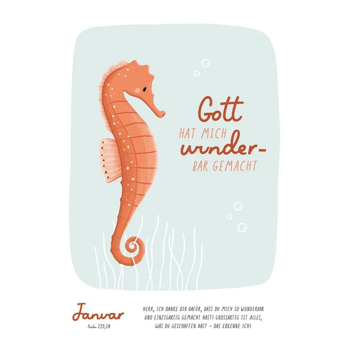 Ein prägnanter Satz, wie z.B. "Gott hat mich wunderbar gemacht" ist groß abgedruckt und wird schon von den Kleinsten verstanden. Die passende Bibelstelle steht unten auf der Kalenderseite.