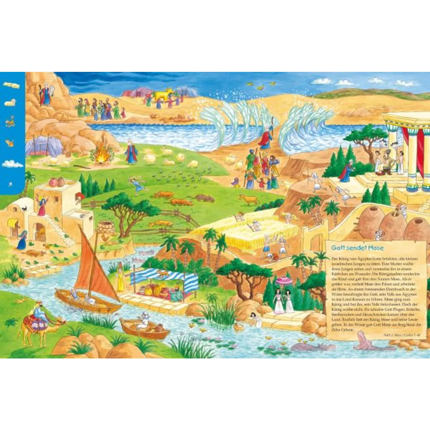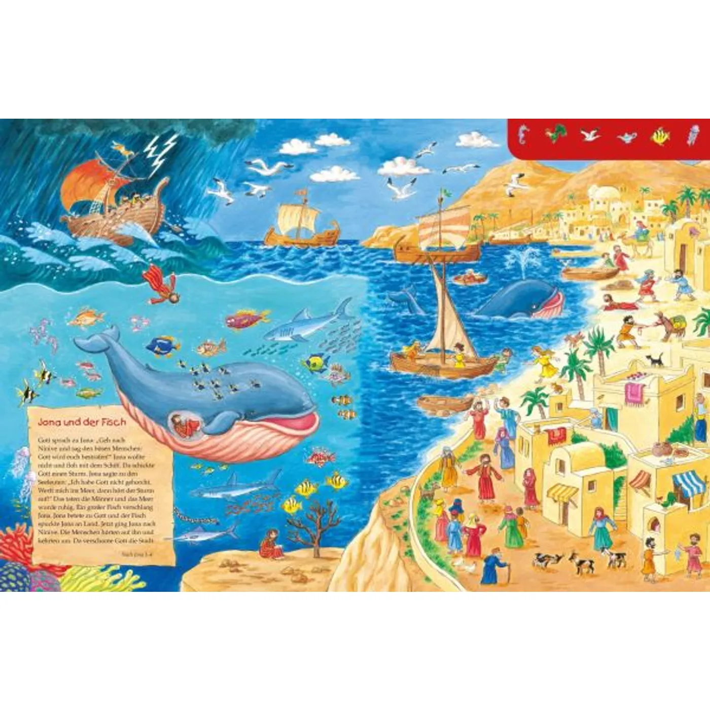 Das großformatige Pappbilderbuch lädt mit lustigen und detailreichen Illustrationen zum Forschen und Entdecken der Geschichten aus der Bibel ein: Die Erschaffung der Welt, Noah und die große Flut, Gott sendet Mose, David wird König, Jona und der Fisch. An den Bildrändern finden sich jeweils die Personen, Tiere und Dinge, die im Bild zu suchen sind. Eine Nacherzählung auf jeder Doppelseite führt noch tiefer in die Geschichte ein.