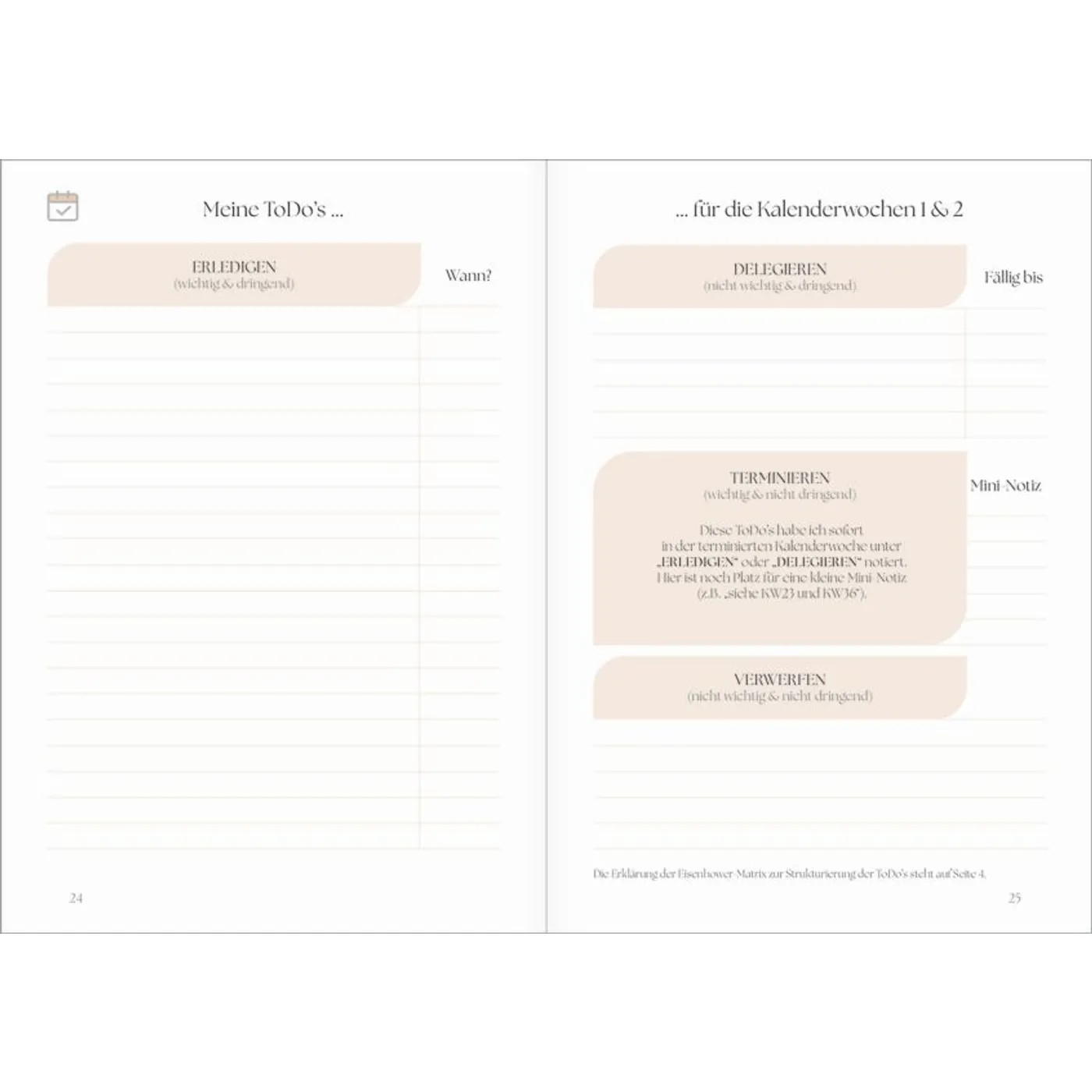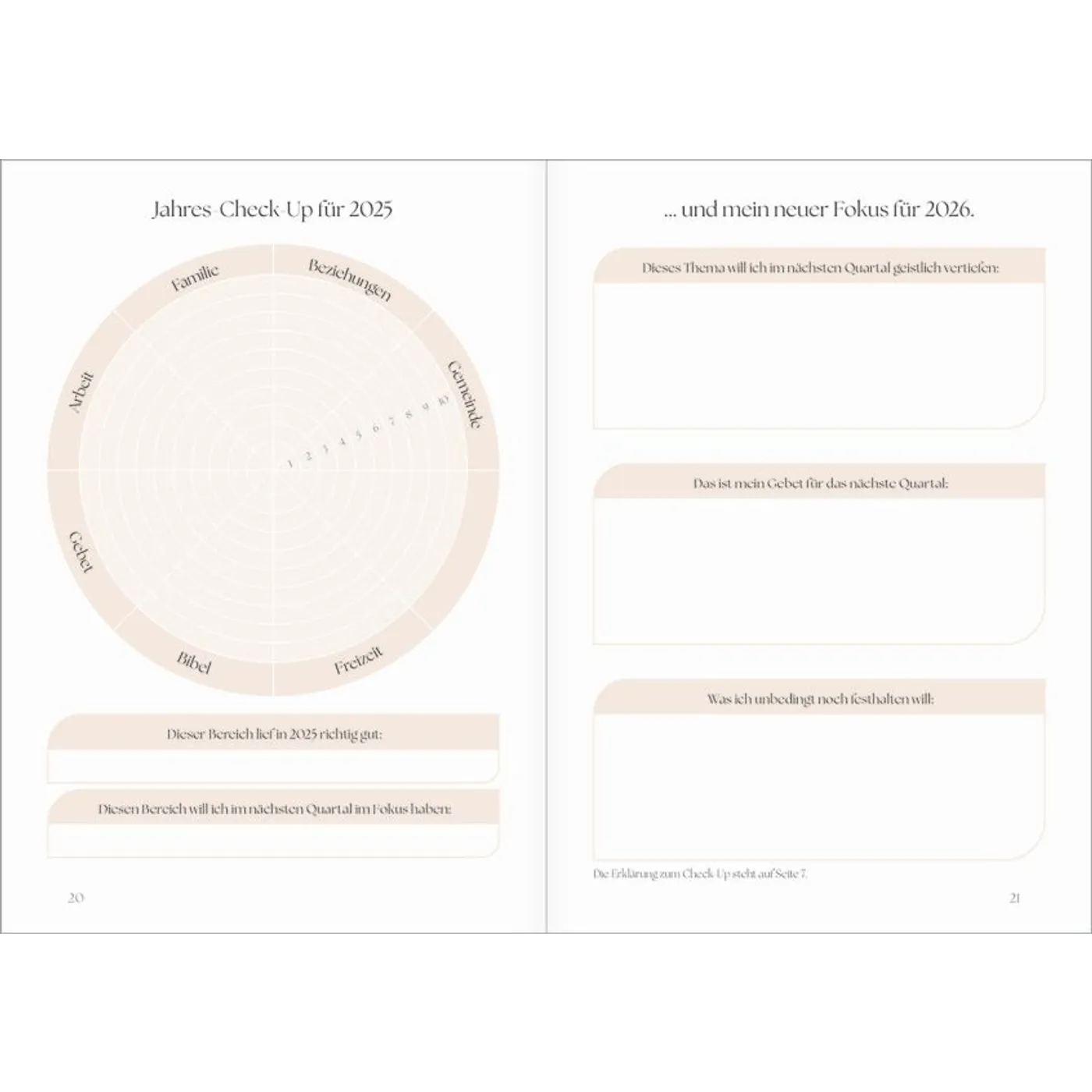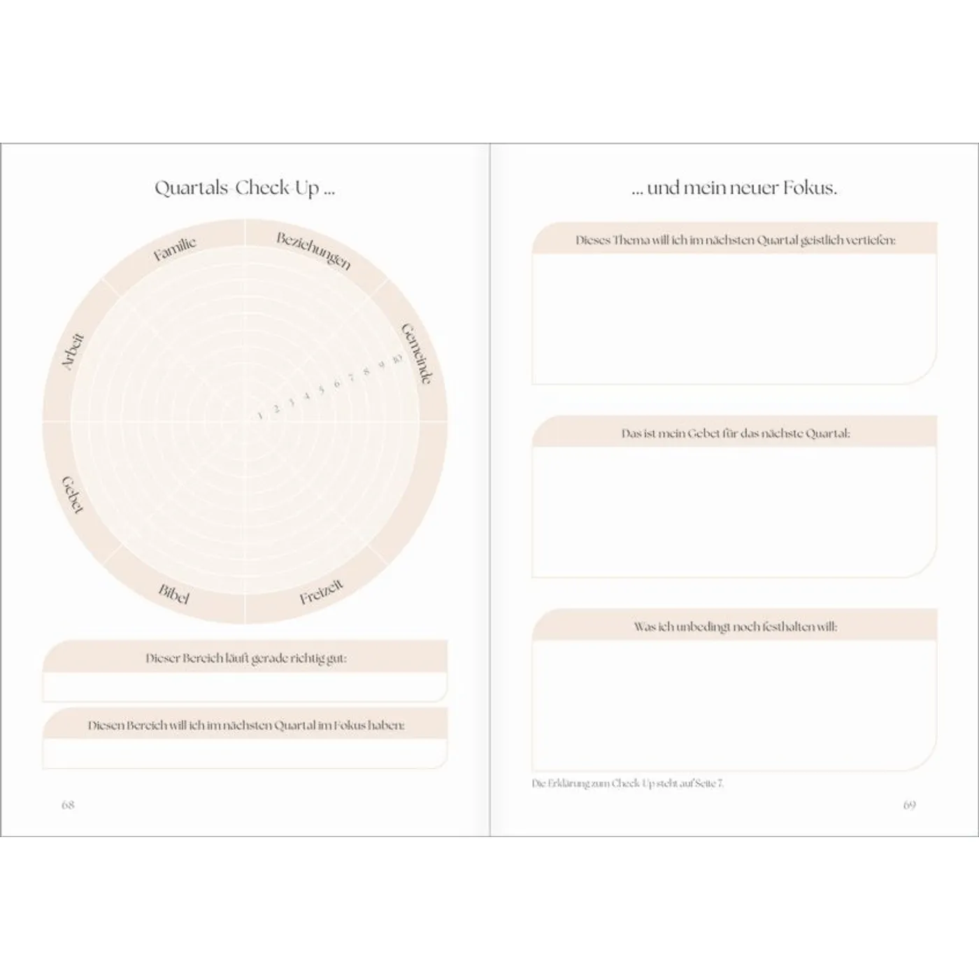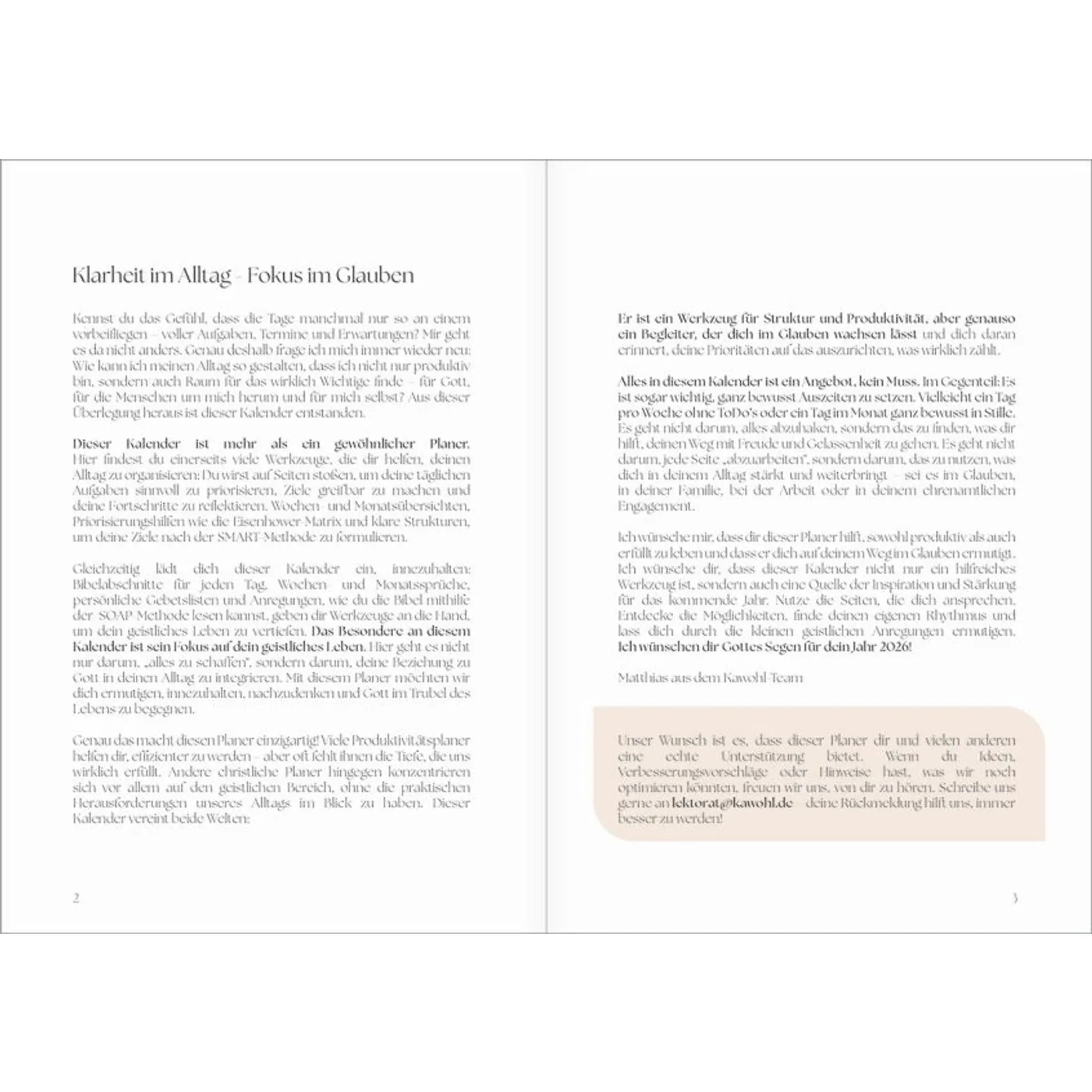 Mit klaren Wochen- und Monatsübersichten, gut erklärten Tools wie der Eisenhower-Matrix und SMART-Zielen sowie täglichen Bibeltexten, Gebetsseiten, Notizseiten und einigen weiteren Angeboten bietet er eine einzigartige Verbindung von Struktur im Alltag und geistlichem Leben.