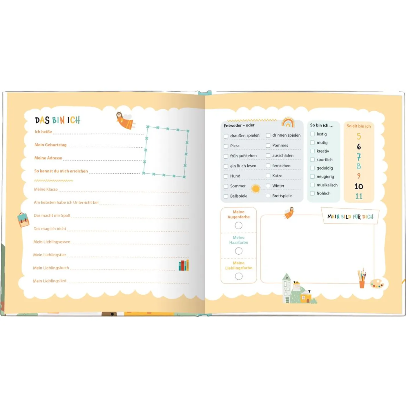 – Viel Platz zum Kreativwerden: Eintragen – Ankreuzen – Malen – Einkleben