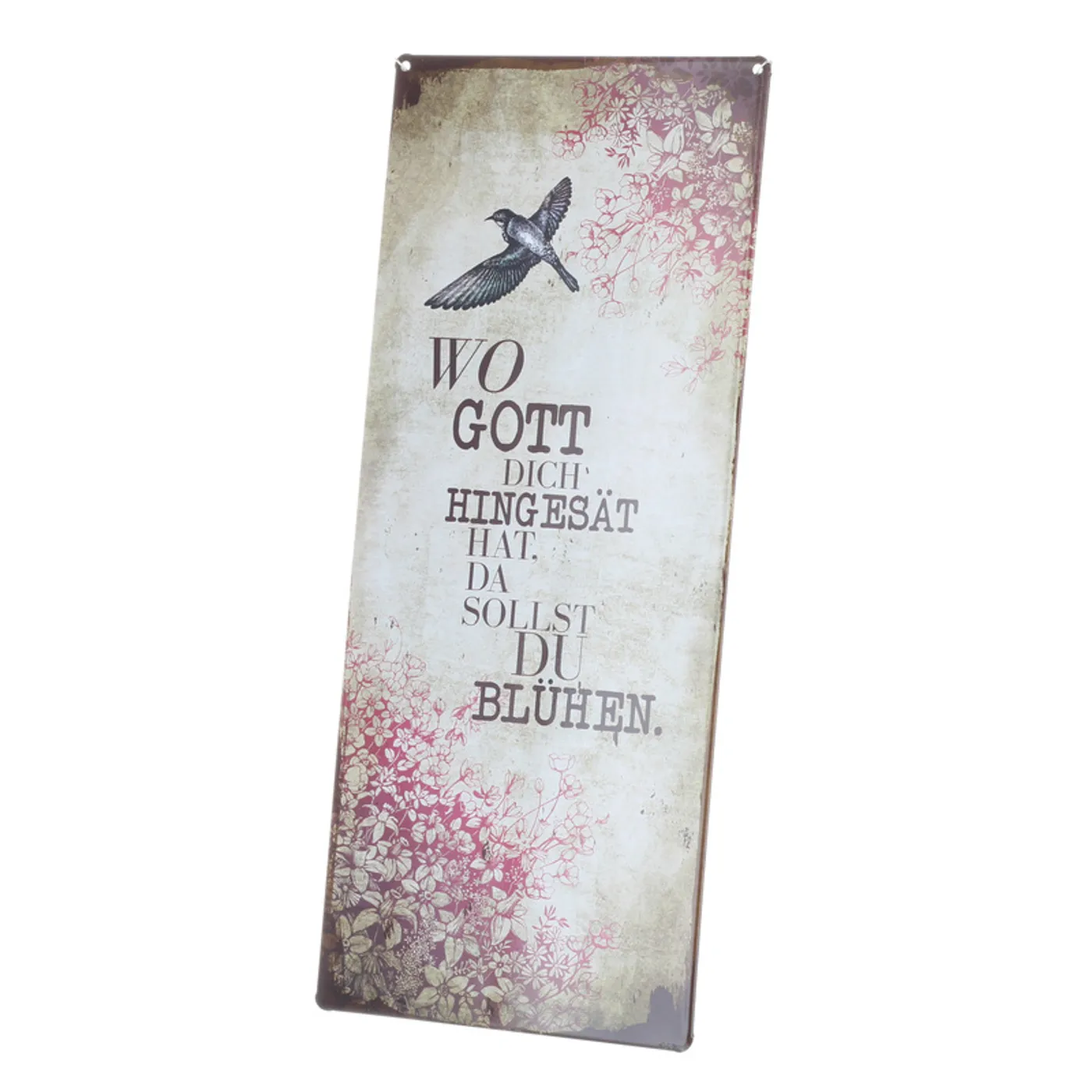 "Wo Gott dich hingesät hat, da sollst du blühen." Dieses dekorative Metallschild passt in jede Zimmerecke.