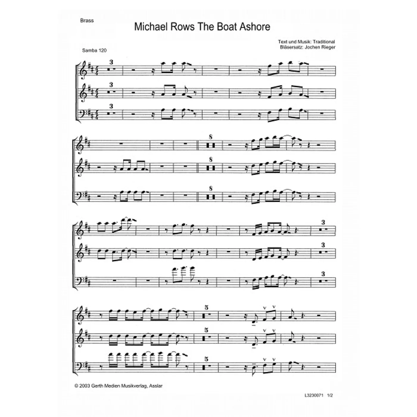 Michael Rows The Boat Ashore (diese Variante haben Sie gerade ausgewählt) (modern, Bläser, Bläserpartitur, Partituren, dreistimmig, mit Akkorden, D-Dur) Jochen Rieger (Bläsersatz) |