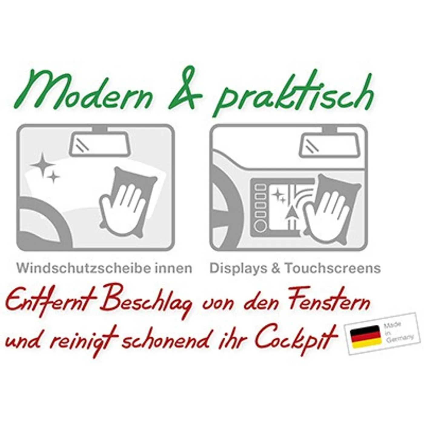 Entfernt Beschlag und Schmutz von der Windschutzscheibe, entfernt Fingerabdrücke von Navigations-Displays sowie Touchscreens, schnell und gründlich ohne Wasser und Chemie.