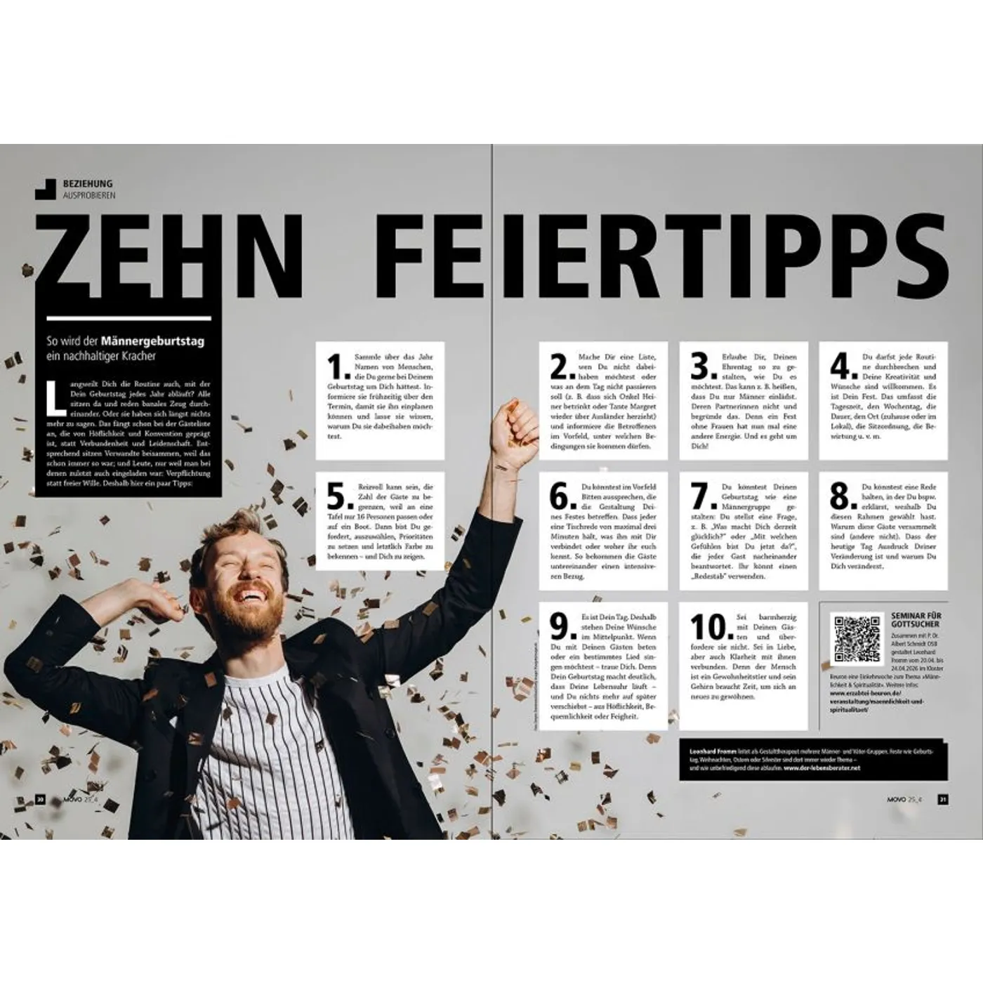 Das Männermagazin – voller Tatkraft, Herz, Courage, Wissen, Lust und Inspiration. In den vier Rubriken „Job“, „Beziehung“, „Glauben“ und „Auszeit“ finden sich kantige Artikel, die genau in den Männer-Alltag passen. Nicht zu lang, klar und auf den Punkt. In MOVO gibt es ehrliche Lebensberichte, Experten-Interviews, spannende Fakten, Tipps zum Ausprobieren, aber auch nachdenkliche Zwischentöne. Abenteuer haben Platz, genauso wie Alltägliches. Tiefgründige Artikel, ebenso wie Texte mit einer ordentlichen Portion Humor. Von Autoren, die wissen wovon sie schreiben. Verpackt in ein schnörkellos-schönes Design. Besonders beliebt: Angeberwissen für die Frühstückspause und die Kolumne „Claudia wundert sich“. Die MOVO-Themen: Mannsein zwischen Klischee und Wirklichkeit, Männer-Freundschaft, Glaube und Zweifel, praktische Tipps „So ziehen Sie der Aufschieberitis den Zahn“ oder „Sieben Tipps für ein sicheres Auftreten im Job“, Scheitern und Fehler machen, Abenteuer in der Wildnis, im Matsch, in luftiger Höhe oder beim Bier brauen, die eigene Komfortzone verlassen, Vorbild sein, Sex und wie er richtig gut wird und vieles mehr … MOVO ist das Geschenk für den Mann, Bruder, besten Freund oder Sohn. Egal ob zum Geburtstag, zum Vatertag, zu Weihnachten, zum Umzug oder zum neuen Job. Was Leser über MOVO sagen: „Mann ist mehr, als wir oft hören! Mit Feingefühl und Vision habt ihr mir Gottes Perspektive auf manche Themen nähergebracht – das hat einen bleibenden Eindruck hinterlassen!“ Ludwig
