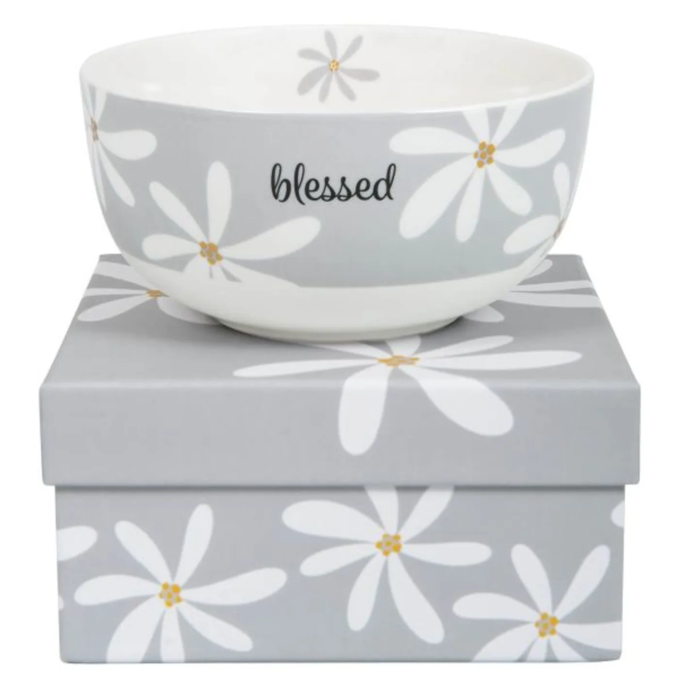 Passend zur neuen Tasse gibt es auch die Müslischale "blessed" , mit großen weißen Blumen auf hellgrauem Hintergrund. Richtig schönes Geschenk für das morgendliche Müsli, für Snacks oder Suppen.