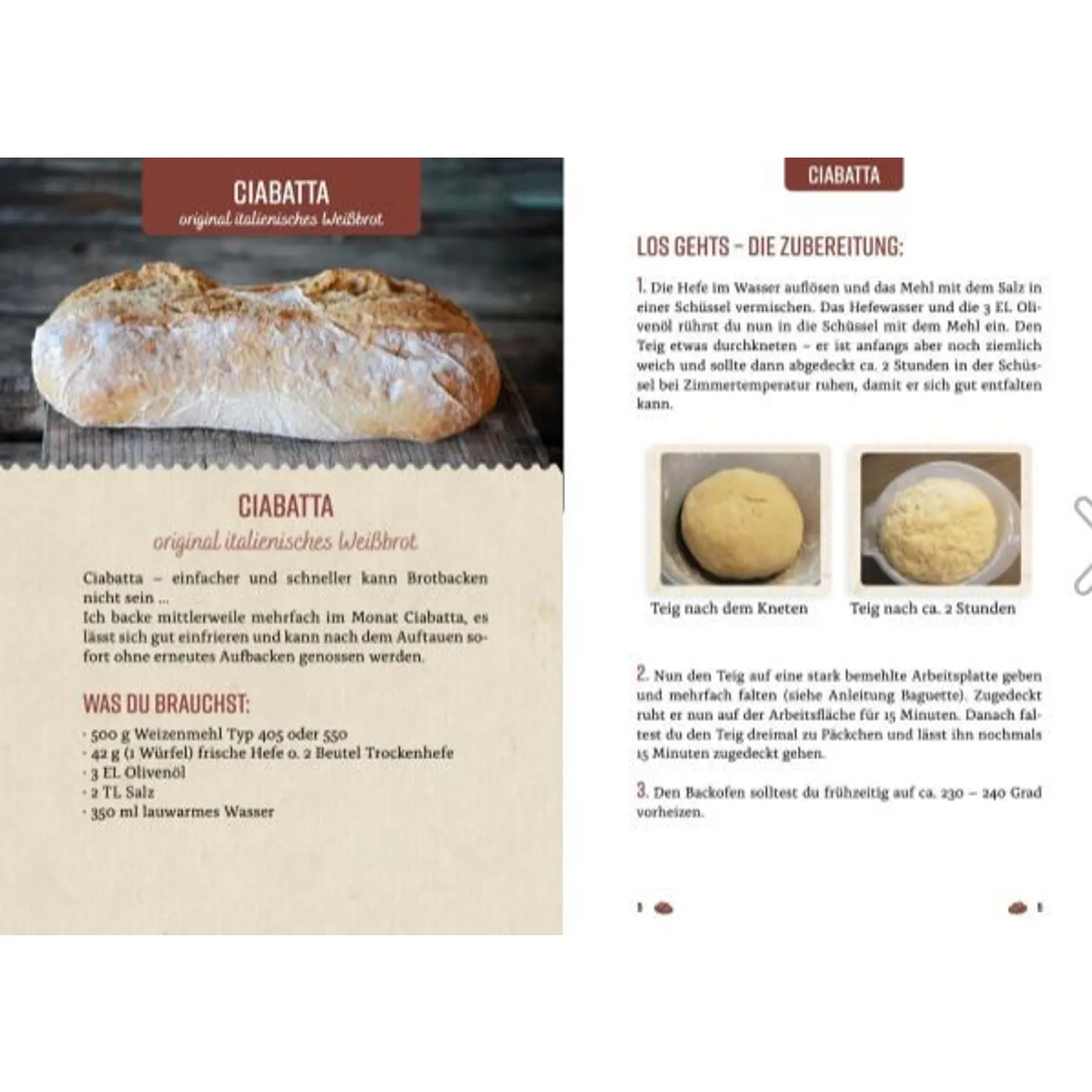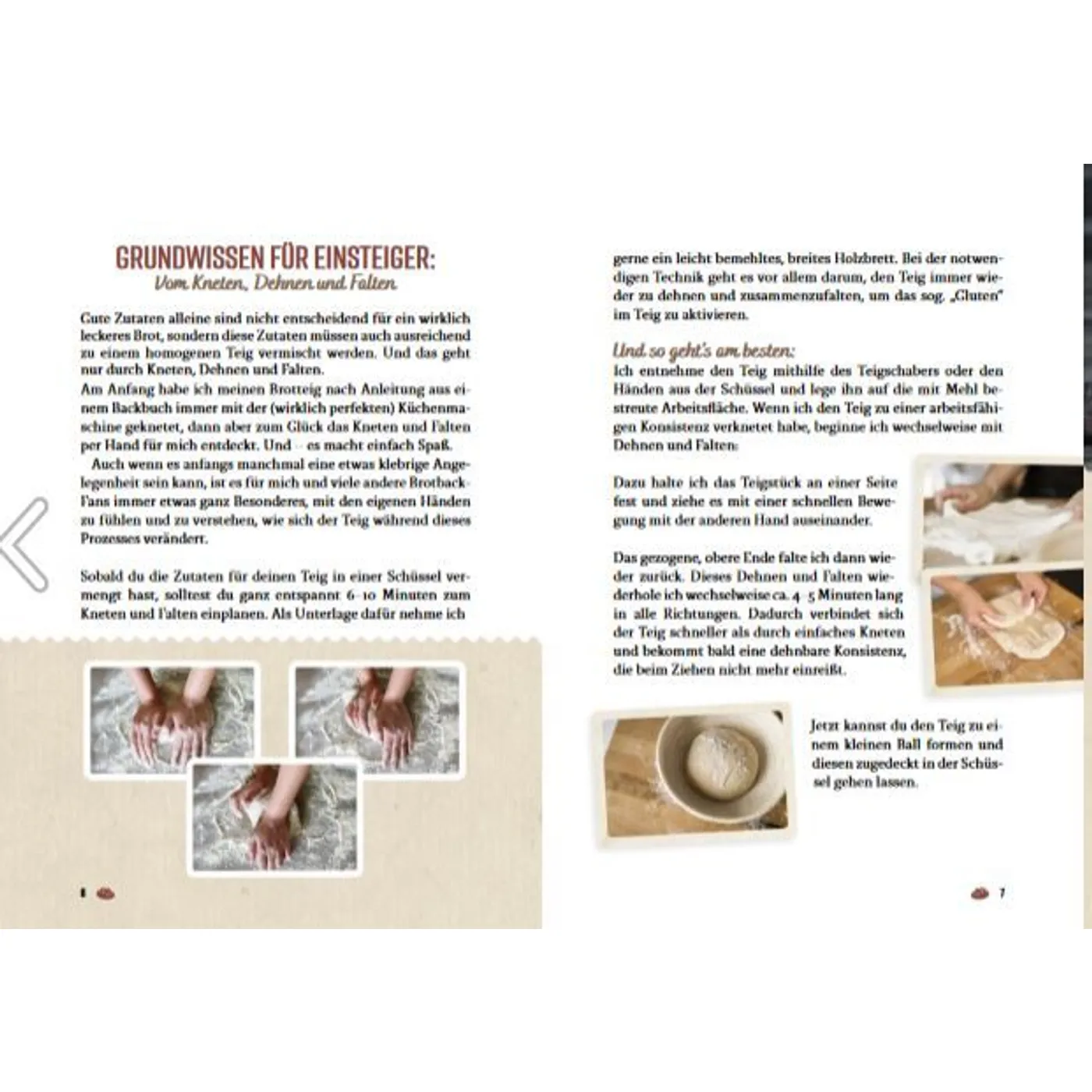 Optisch ist das Büchlein sehr ansprechend gestaltet! Hochwertig gebunden und mit dazu passendem Lesezeichen. Das Cover mit dem tollen Brot, macht gleich Lust so etwas selber zu backen. Auch die übrigen Bilder sehen sehr appetitlich aus. Die braune Farbgebung der Leinenbindung, wie auch bei den Überschriften ist sehr harmonisch und passend zum Thema gewählt. Durch das kleine Format braucht es nicht viel Platz auf der Arbeitsfläche oder im Schrank. Leider ist das Büchlein in der Praxis etwas unpraktisch, da es nicht aufgeschlagen offen liegen bleibt. Eine Spiralbindung wäre hier ideal gewesen. Durch das relativ kleine Format muss man dann auch öfters umblättern, was mit teigverschmierten oder nassen Finger keinen Spass macht. Die Anleitungen sind einfach, verständlich und mit Tipps angereichert, was für mich als Anfängerin sehr wichtig ist. Doch durch gewisse Umstände habe ich so eine Art Hassliebe zu diesem Büchlein entwickelt. Unglücklicherweise wurde bei den Angaben über die verschiedenen Mehltypen nicht berücksichtigt, dass diese nur für Deutschland stimmen und die Schweiz oder Österreich, andere Bezeichnungen verwenden. So musste ich dann auch als erstes im Internet nachschauen welches Mehl ich denn nun verwenden sollte. Mit dem richtigen Mehl machte ich mich ans erste Rezept, wo dann auch gleich ein Druckfehler bei der Flüssigkeitsmenge, die nächsten Schwierigkeiten mit sich brachte… Zum guten Glück habe ich es doch noch geschafft und hatte zum Schluss ein leckeres Resultat. Das nächste Backerlebnis wurde dann zum vollen Erfolg auf ganzer Linie und stimmt mich hier zum Ende versöhnlich! -