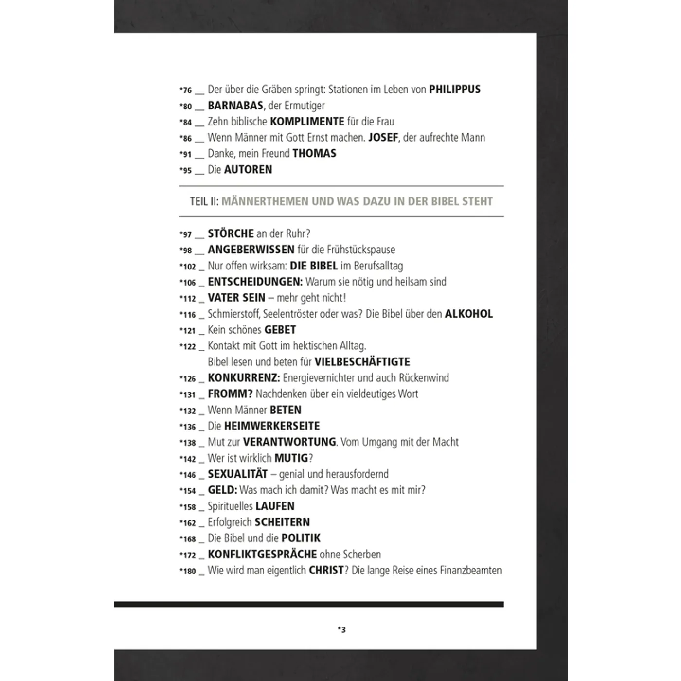 Braucht es eine Bibel extra für Männer? Darüber kann man unterschiedlicher Meinung sein. Aber man(n) hält mit dieser Bibel ein gewichtiges und wertvoll anmutendes Exemplar in den Händen. Neben dem Text der Neues Leben-Übersetzung beinhaltet es rund 40 zusätzliche Artikel. Darunter sind Andachten zu Männergestalten der Bibel genauso wie Gedanken zu Themen zu finden, die mutmaßlich Männer interessieren. Außerdem sind noch Rezepte von Grillmeister Dän Klein in dieser Bibel versteckt. Die unterschiedlichen Andachten zu den Männern der Bibel wirken dabei anregender und lebendiger, ja sogar realistischer als die manchmal etwas klischeehaft und moralisierend wirkenden Beiträge im zweiten Teil - vielleicht, weil gerade die Männer der Bibel so facettenreich sind und sich einem klaren "Männerbild" entziehen. Die Bibel zu lesen lohnt immer. Aber die beigefügten Artikel laden Männer (und auch Frauen, die sich vom Titel nicht abschrecken lassen!) ein, ihre Begegnung mit der Bibel zu vertiefen.