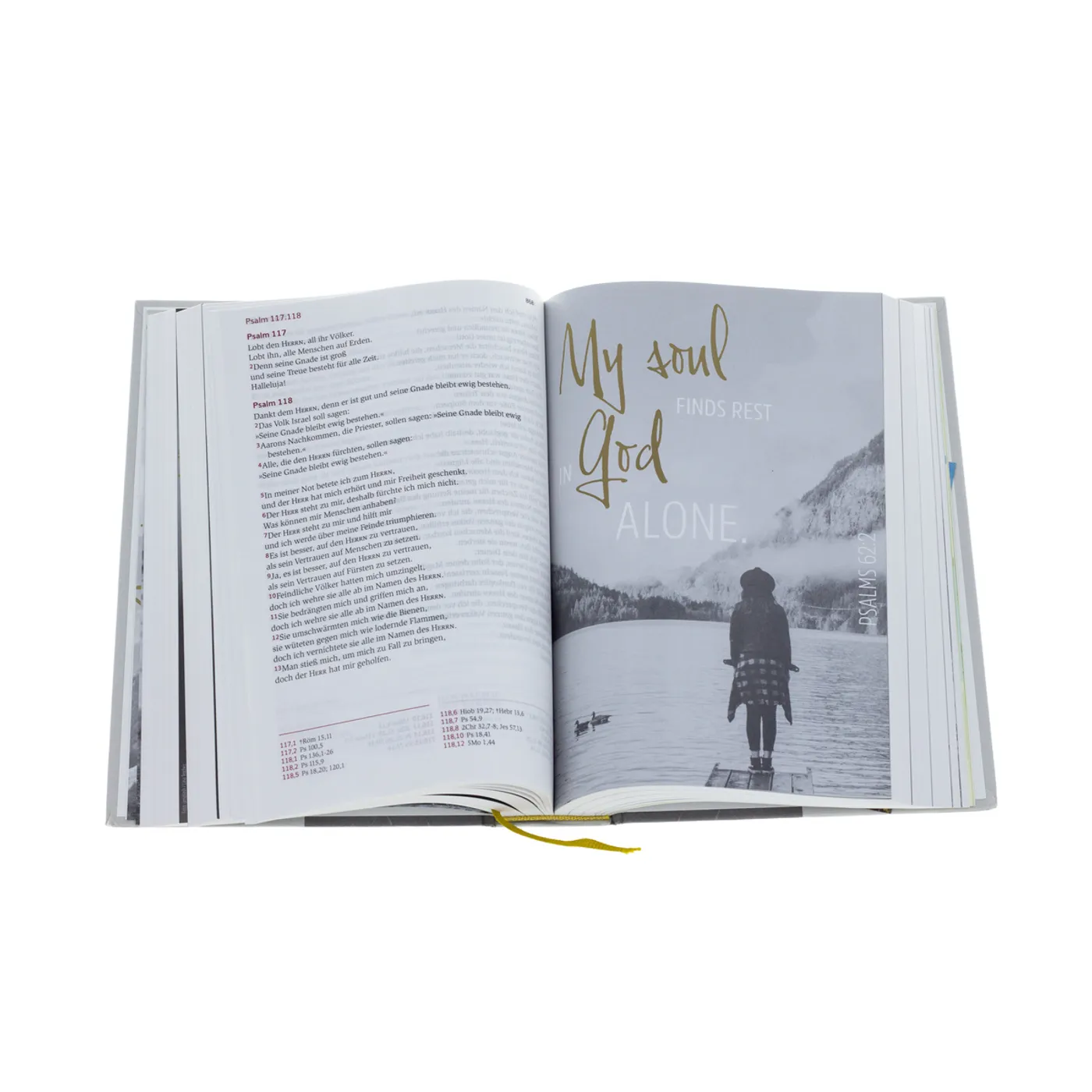 Es war für mich wirklich wie ein nach Hause kommen, als ich diese Bibel angefangen habe, zu lesen. Die Schwere, die manchmal durch schwierige Themen und Texten da ist, weicht den mutmachenden Botschaften. Die Fotos und die Botschaften begleiten mich oft. Es sind so wohltuende Worte, wie z.B. "His grace covers ME" Und manchmal öffne ich die Bibel nur, um diese Sprüche zu lesen und die Fotos anzuschauen, das tut so gut.