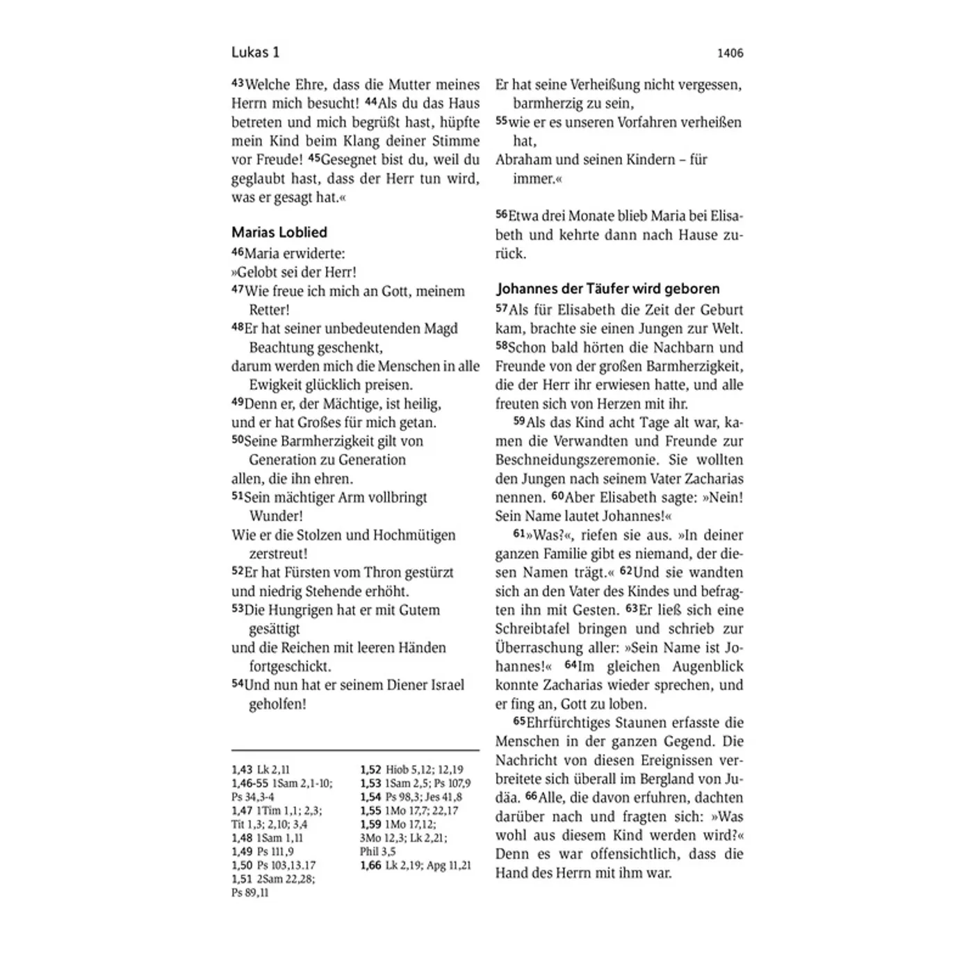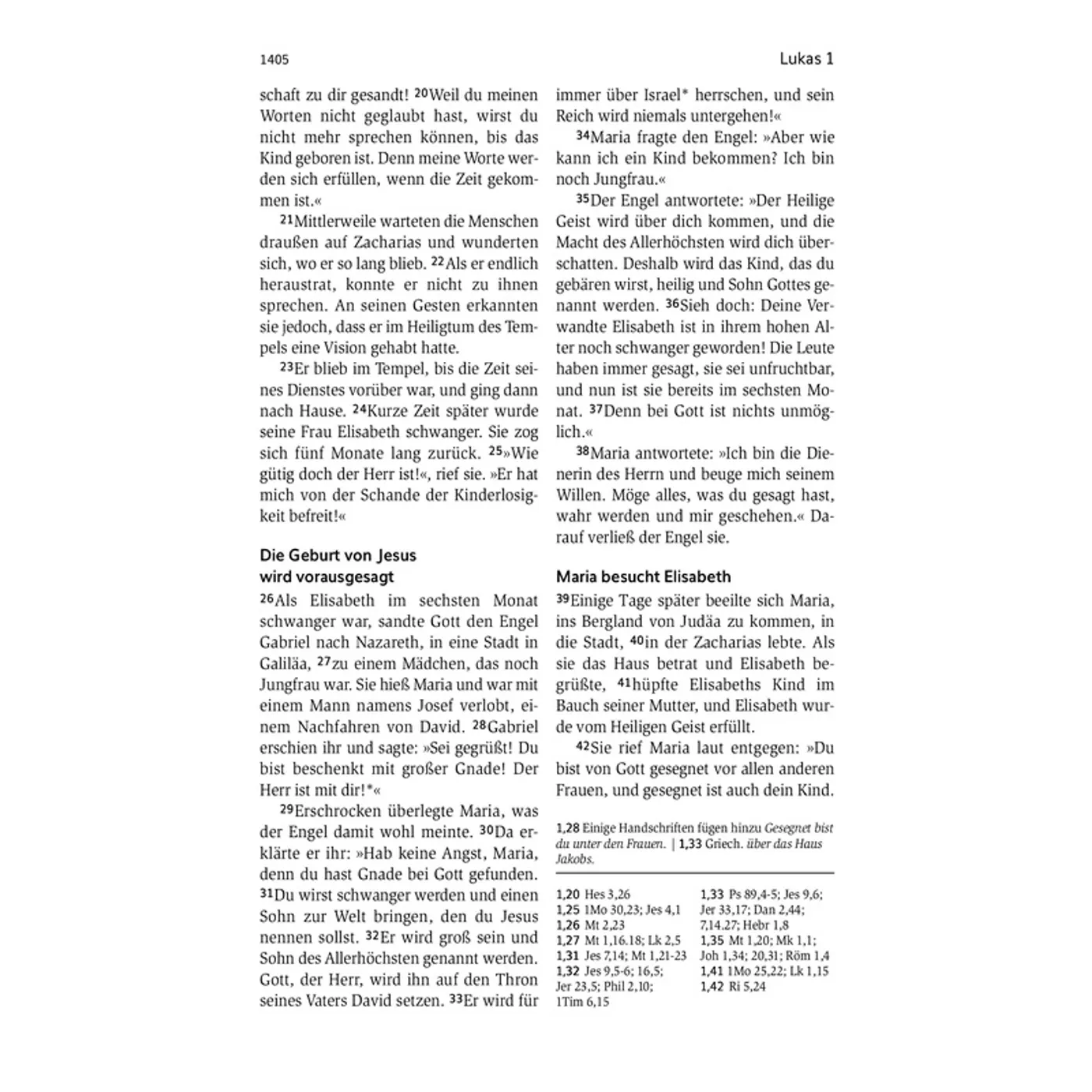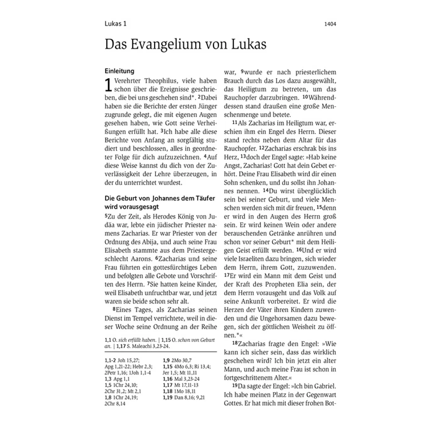 Auch insgesamt finde ich die Bibel schön gemacht. Sie hat immer wieder Verweisstellen und zusätzliche Fußnoten ohne es damit zu übertreiben. Genau nach so einer schlichten, handlichen Bibel habe ich gesucht.