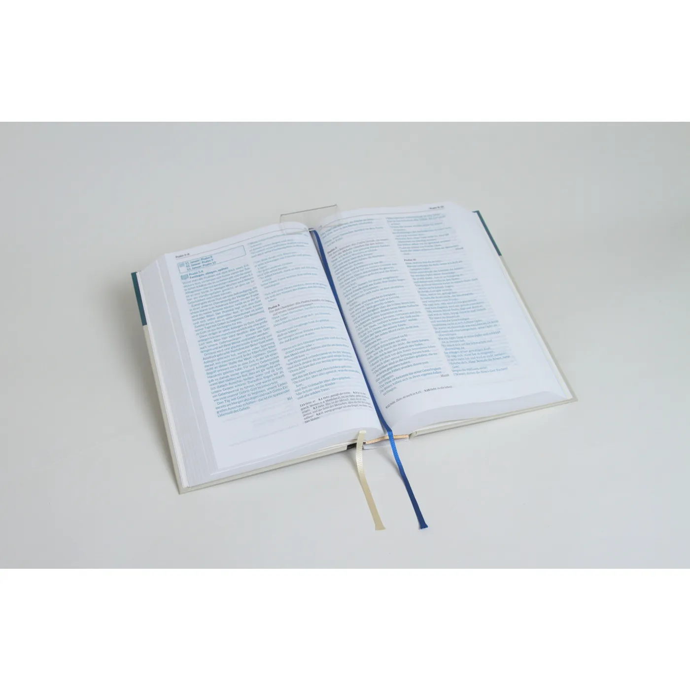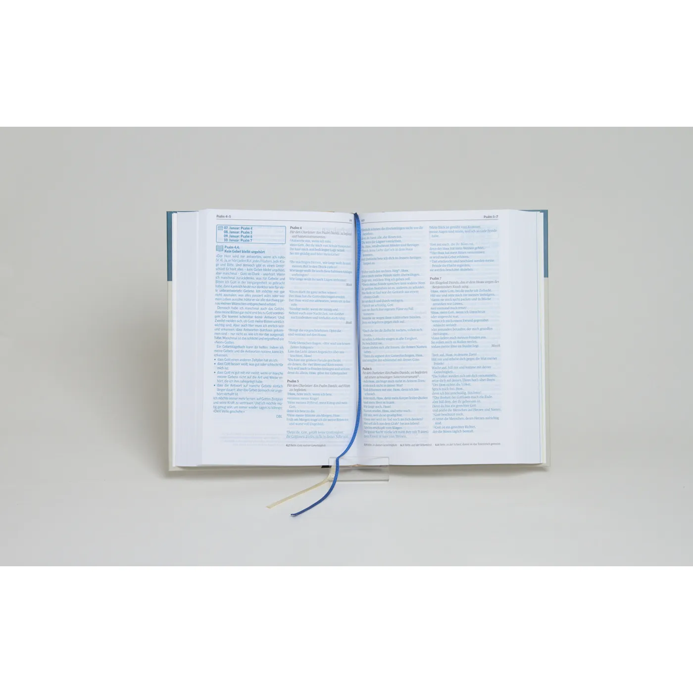 Die Bibel hat zwei Lesebändchen, weiß und blau, das blaue nutzen wir für unsere täglichen Psalmen, das weiße legt meine Tochter in die Seite, wo sie weiterlesen möchte oder Fragen hat, die sie dann mit mir bespricht oder wenn sie sich einfach nur über ein Thema näher unterhalten möchte.