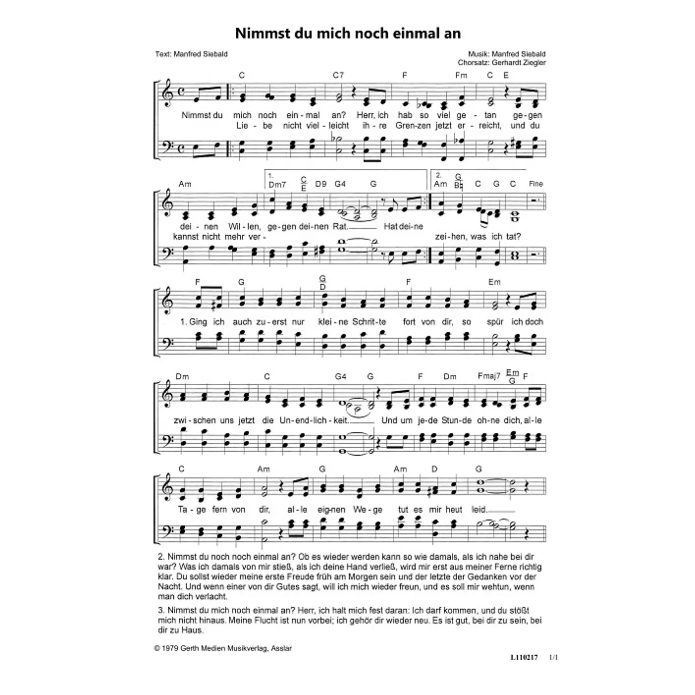 Nimmst du mich noch einmal an (diese Variante haben Sie gerade ausgewählt) (Gemeindelied, traditionell, gemischter Chor, mit Akkorden, vierstimmig, C-Dur) Manfred Siebald (Komposition, Text), Gerhardt Ziegler (Bearbeiter) |