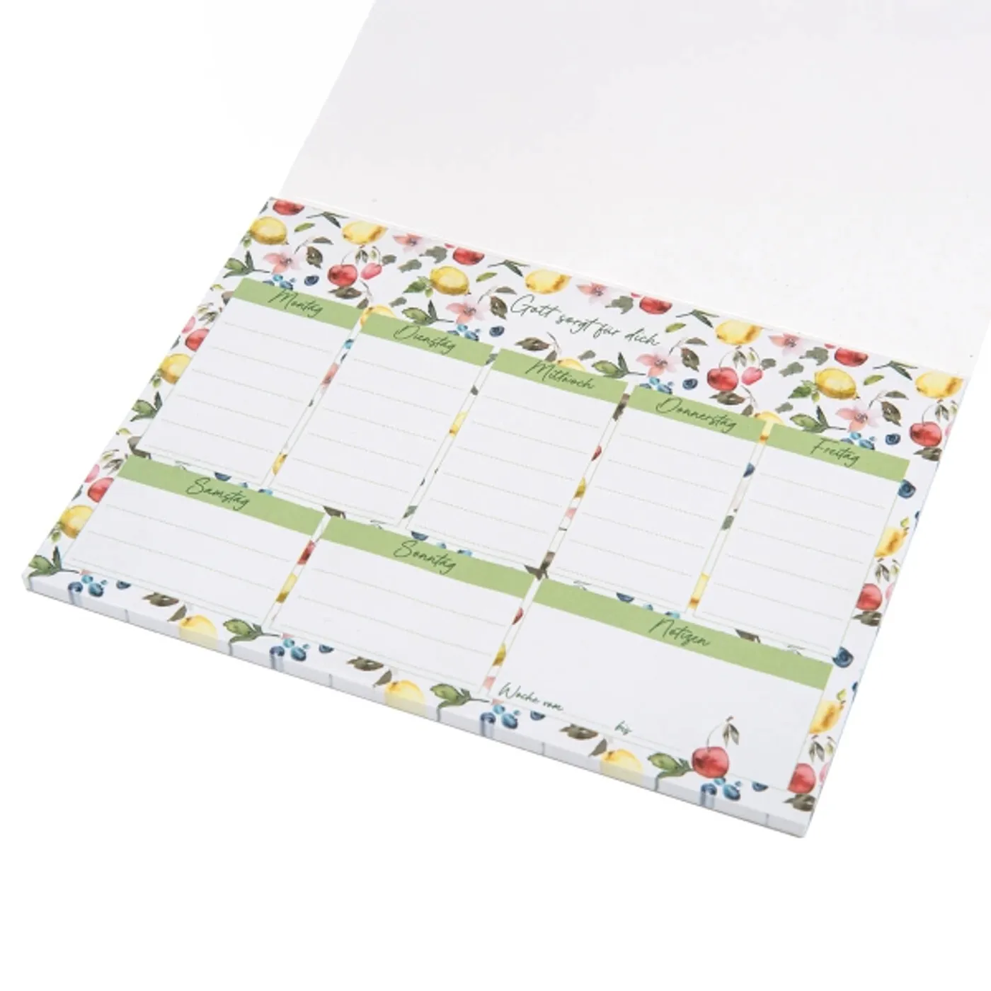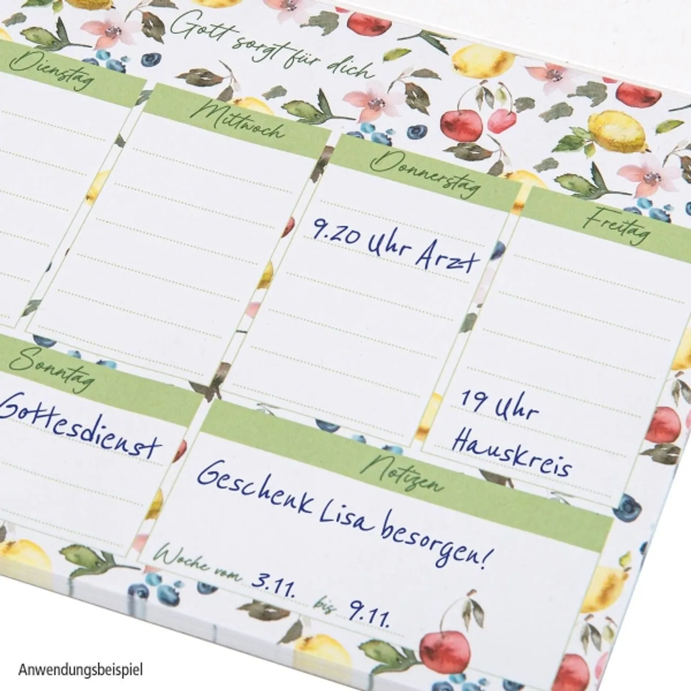 Sorgt für Übersicht und ist ein tolles kleines Geschenk: Termine und Notizen für eine Woche können in den praktischen Block eingetragen werden. Der Wochenplaner ist mit dem neuen Früchtemotiv "Gott sorgt für dich" schön gestaltet.