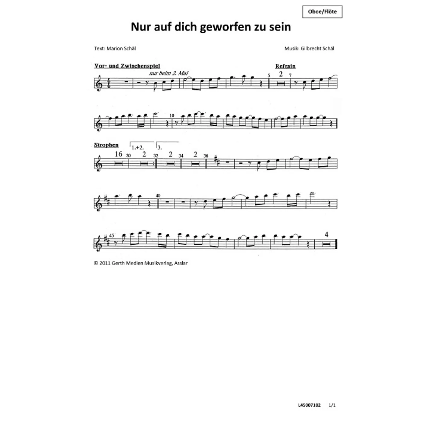 Nur auf dich geworfen zu sein (Oboe / Flöte) (diese Variante haben Sie gerade ausgewählt) (traditionell, Orchestereinzelstimme) Gilbrecht Schäl (Komposition), Marion Schäl (Text) |