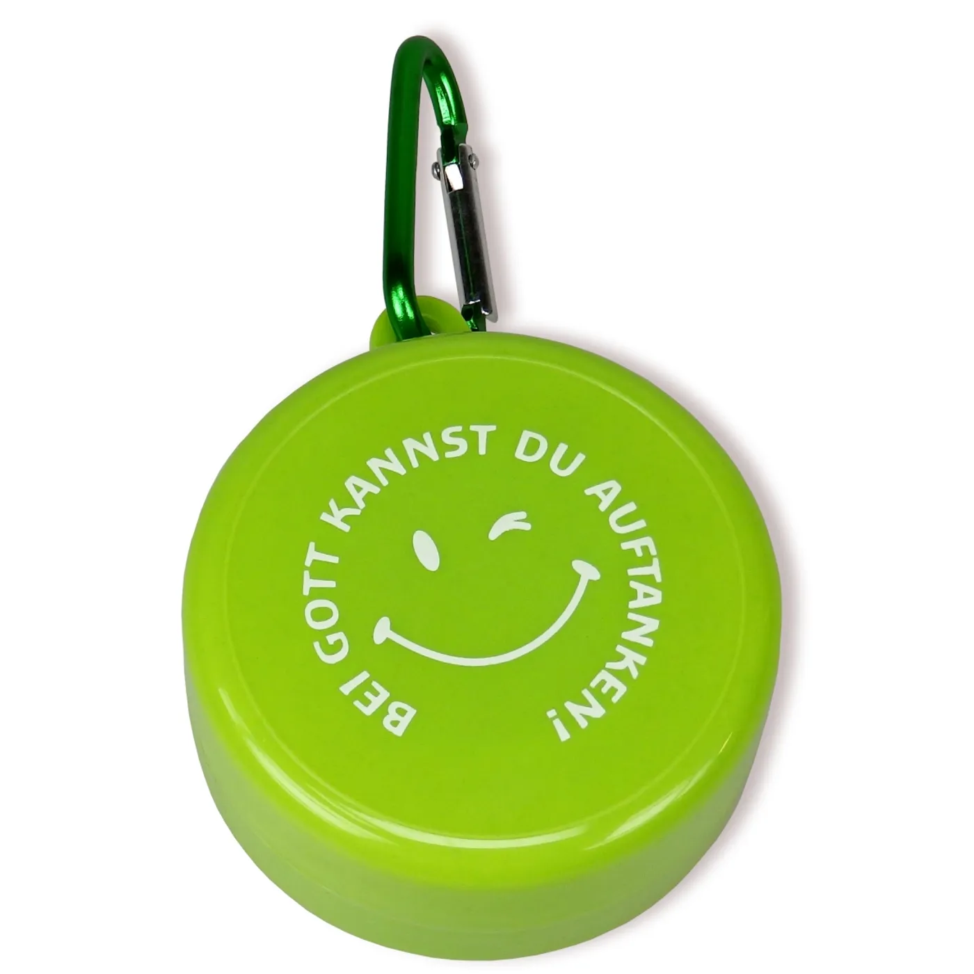 Der praktischer Helfer für unterwegs, stillt den Durst und das ganz ohne Müll: zusammenklappbarer Outdoor-Trinkbecher aus Kunststoff zum Mitnehmen mit Karabiner, kleines Fach im Deckel (innen), ø ca. 6,5 cm, 0,2 ltr.. Textaufdruck: „Bei Gott kannst du auftanken“.