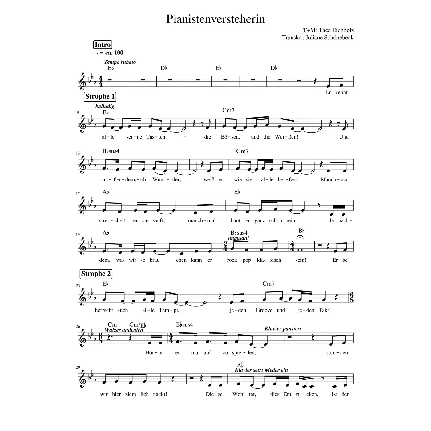 Pianistenversteherin (diese Variante haben Sie gerade ausgewählt) (dreistimmig, einstimmig, Es-Dur) Thea Eichholz (Text, Melodie), Juliane Schönebeck (Melodiebearbeitung) |