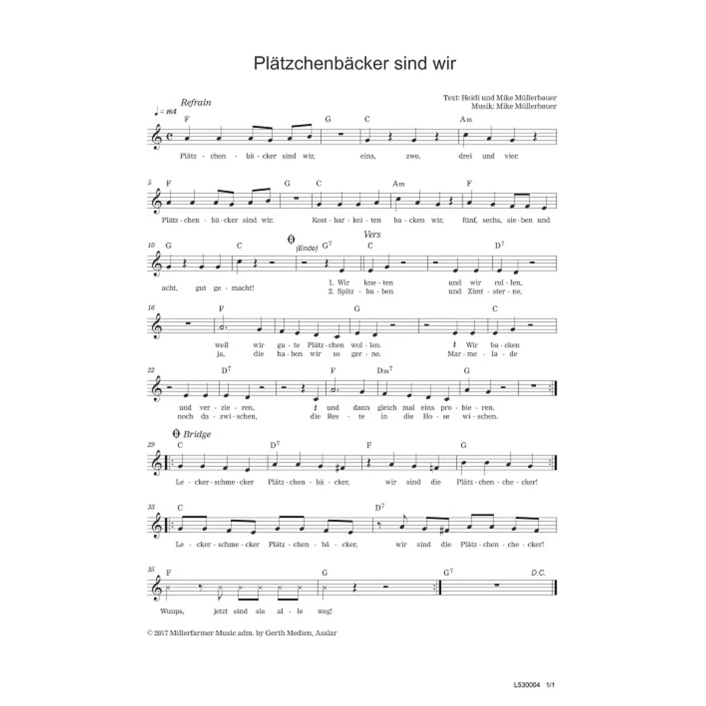 Plätzchenbäcker sind wir (diese Variante haben Sie gerade ausgewählt) (einstimmig, mit Akkorden, F-Dur) Heidi Müllerbauer (Text), Mike Müllerbauer (Komposition, Text) |