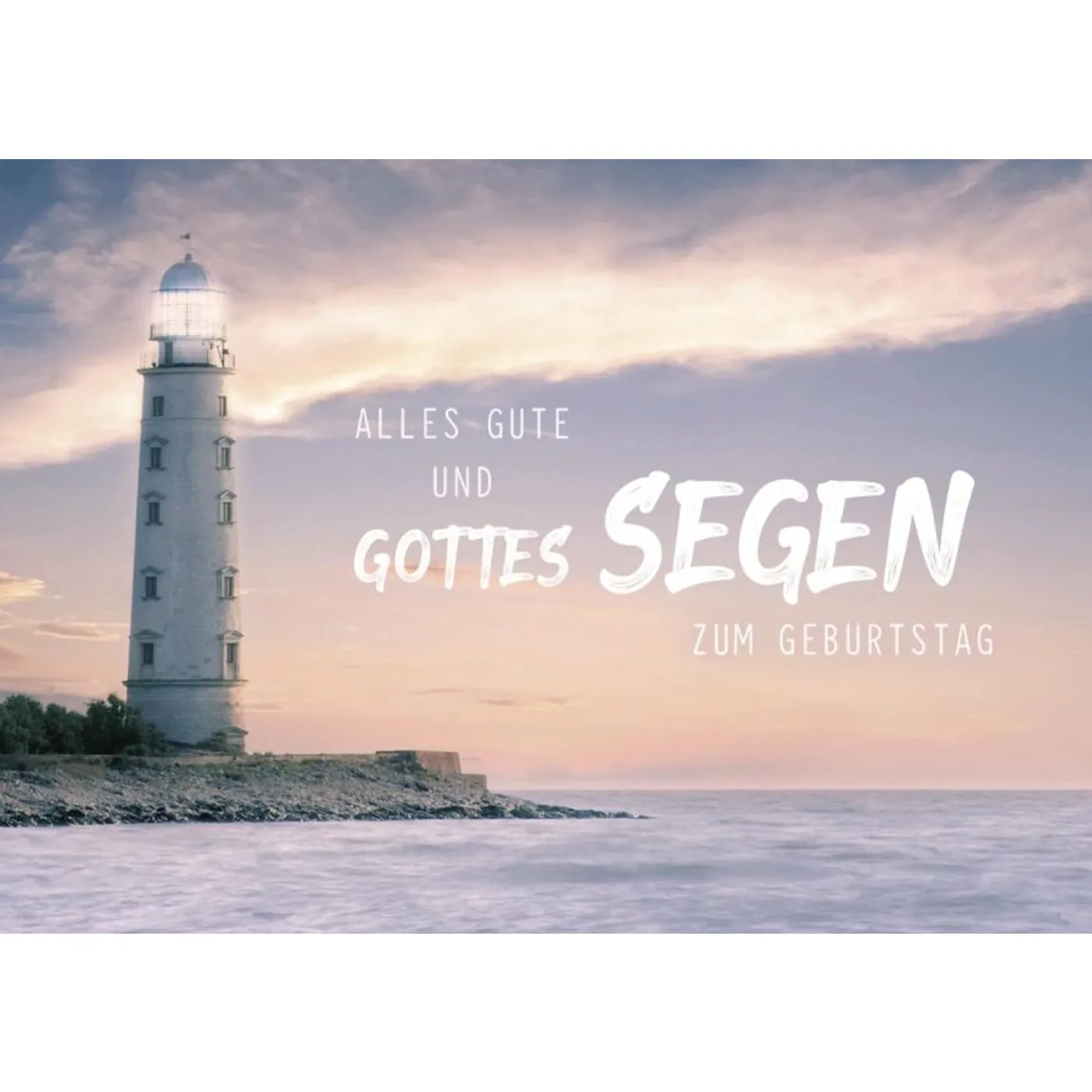 Diese hochwertige Postkarte aus der Gute Worte-Kollektion vermittelt auf stilvolle Weise Segen, Zuversicht und Ermutigung. Auf der Vorderseite ist ein Leuchtturm zu sehen, der ruhig in einer weiten Landschaft steht. Der Himmel leuchtet in warmen Lila- und Orangetönen – eine Abendstimmung, die Frieden und Hoffnung ausstrahlt.
