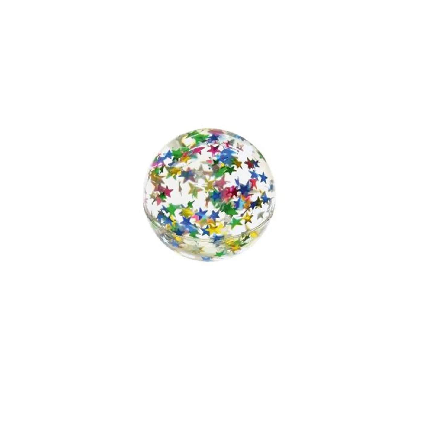 Transparenter Flummi mit vielen bunten Glitzersternen, hübsch verpackt im Organzabeutel. Das tolle Geschenk komplett macht das liebevoll gestaltete Schmuckkärtchen, welches am Beutel angebracht ist.