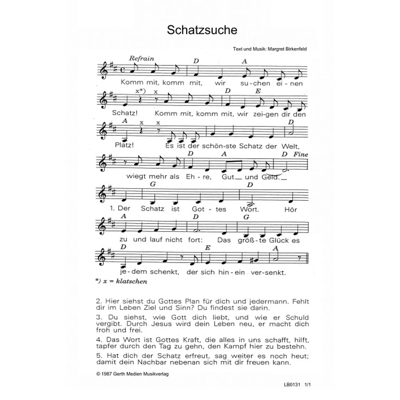 Schatzsuche (diese Variante haben Sie gerade ausgewählt) (einstimmig, mit Akkorden, D-Dur) Margret Birkenfeld (Komposition, Text) |