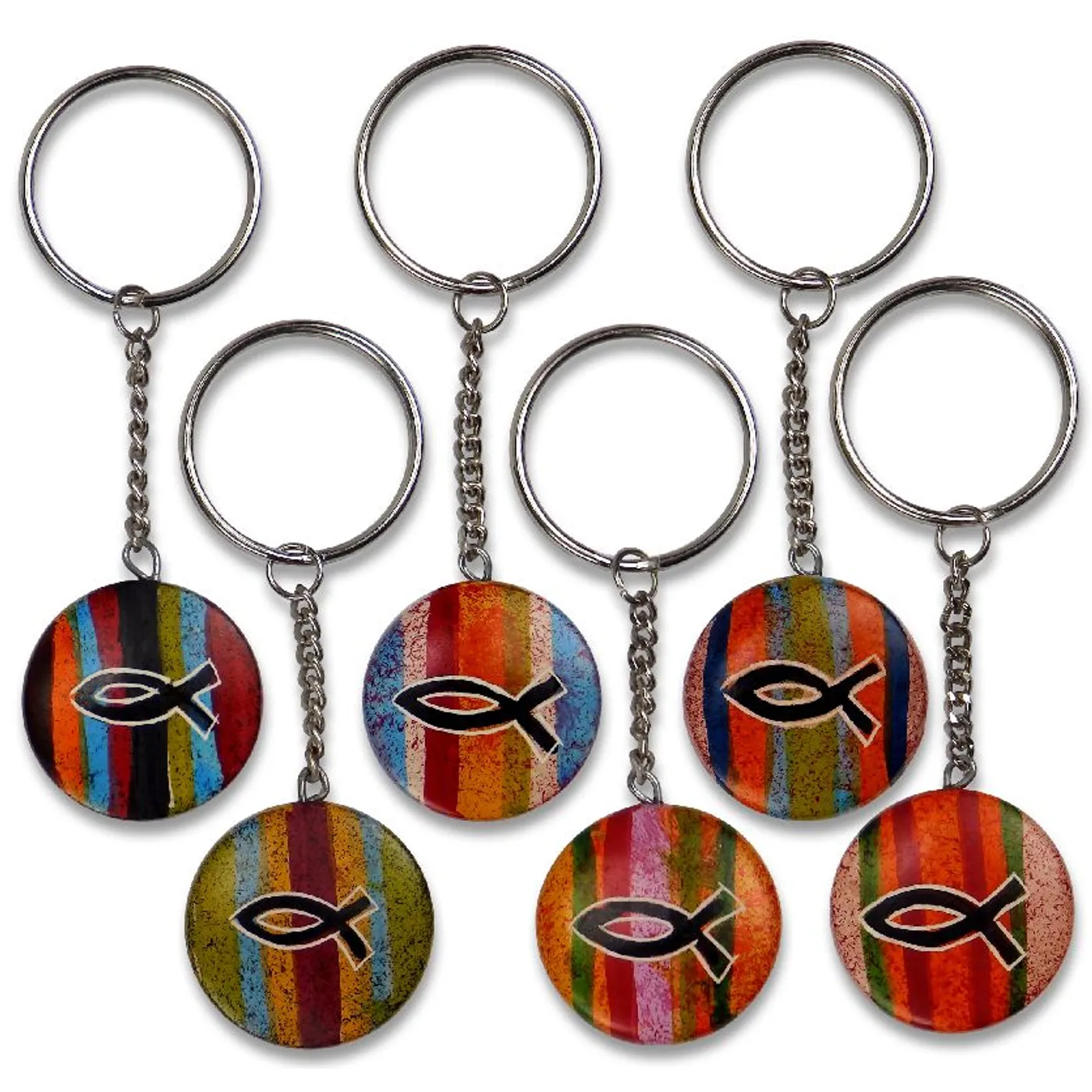 Handgefertigter Schlüsselanhänger aus Speckstein, mit Ichthys-Symbol, ca. Ø 3 cm. Jeder Schlüsselanhänger ist ein Unikat.
