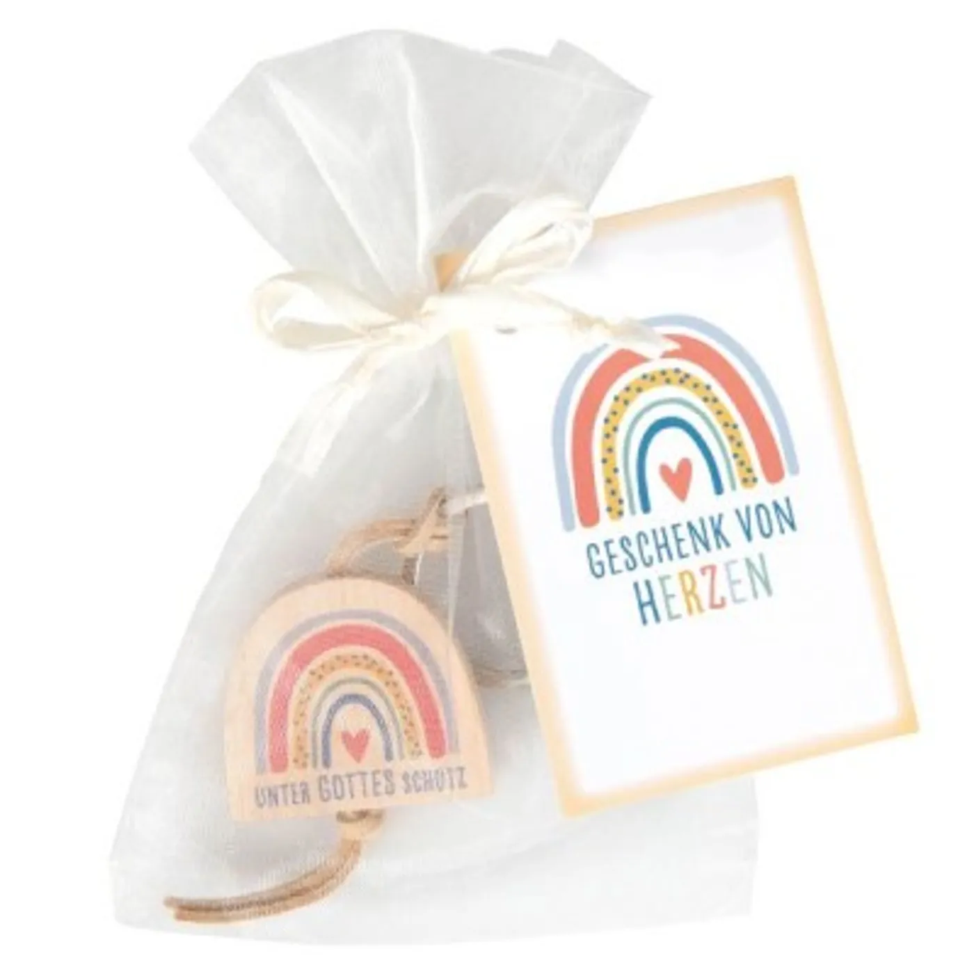 Der Holz naturbelassen Schlüsselanhänger hat richtige Handschmeichler-Qualitäten. Schön farbig bedruckt mit Text.