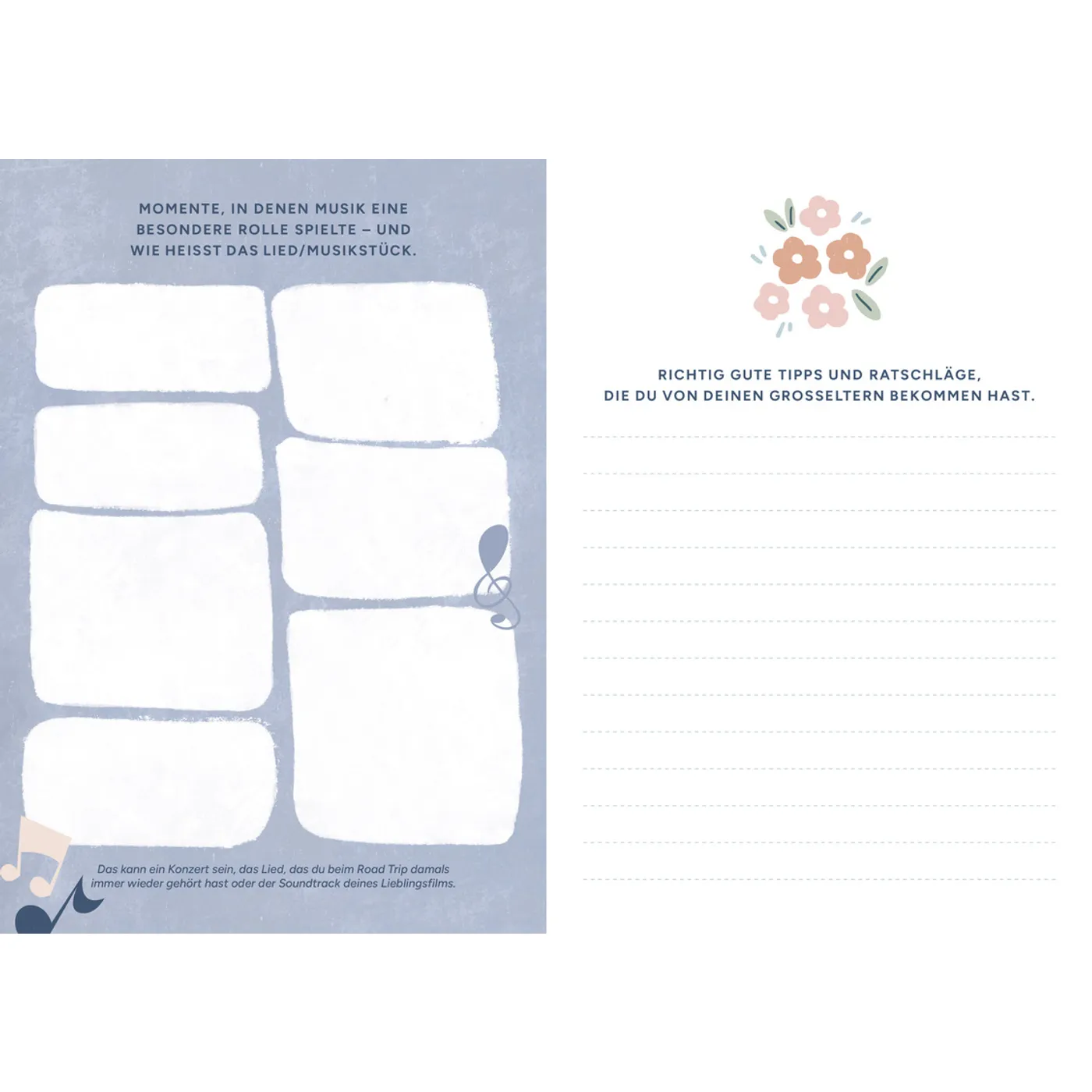 Ab und an sollen auch Schnappschüsse oder Fotos eingeklebt werden, manche Fragen wiederholen sich. Ich mag die Vielfalt der Fragen, die unterschiedlicher Leichtigkeit aufweisen.