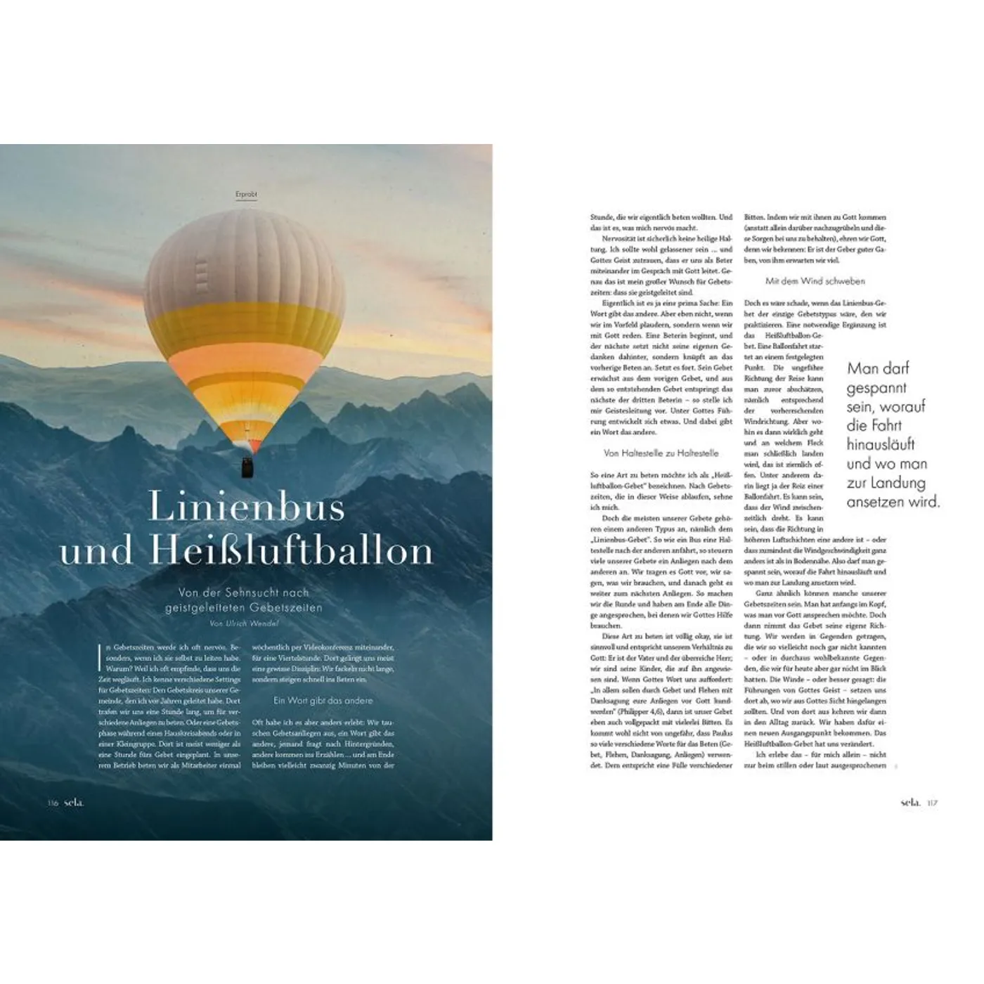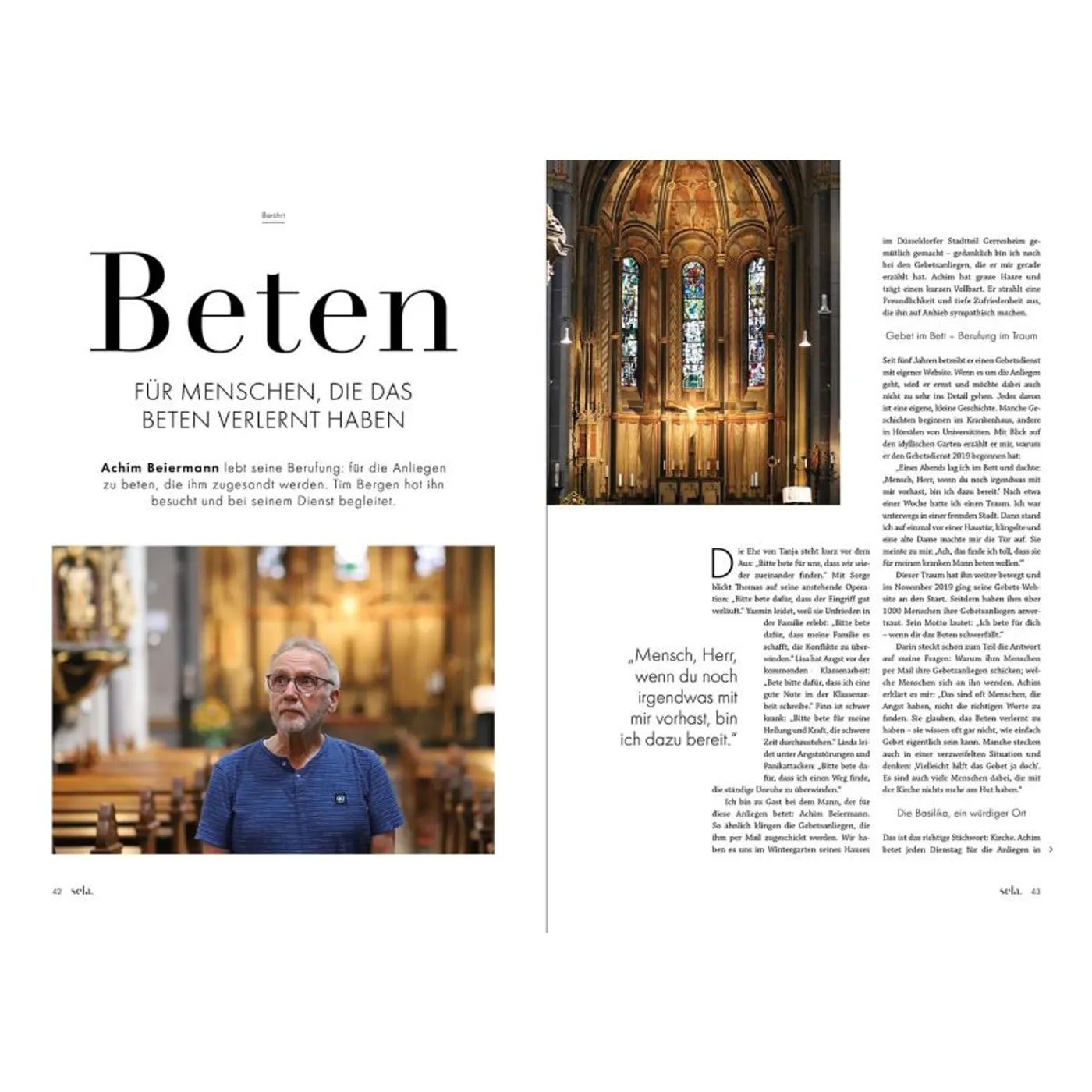 Gebet ist eine Sehnsucht für viele Christinnen und Christen in Deutschland. Um auf diese Sehnsucht Antworten zu geben, entstand das Gebetsmagazin als zentraler Baustein von sela. - Der Gebetsinitiative. Mit vertiefendem Artikel führt das Magazin in ein tieferes und freieres Gebetsleben. Es unterstützt Gebetssehnsüchtige mit authentischen Erfahrungen und Praxistipps. Durch das breite Spektrum an vertretenen Bewegungen, Konfessionen und Prägungen lädt sela. immer wieder dazu ein Neues zu entdecken. Von liturgisch bis charismatisch, von Stundengebet bis Lobpreisszene, von Gebetshäusern bis Fürbittebewegungen ist alles dabei und bereichert das persönliche Gebet. Die 132 Seiten des Magazins kommen in hochwertiger und liebevoller Gestaltung und bieten die folgenden Rubriken: - Berührt. Authentische Erfahrungen mit dem Gebet - Überlegt. Vertiefende Artikel - Erprobt. Methoden, Best Practice, Tipps… - Dossier 2025: Mein Gebetshaus in den eigenen vier Wänden. Orte und Zeiten im Alltag finden, um Gottes Gegenwart zu suchen. Das sagen andere über sela. „Das Magazin Sela schafft Raum für ehrliche, authentische Gebetsmomente und ermutigt Leser, Gott im Alltag zu begegnen. Ich freue mich sehr auf die erste Ausgabe!“ Rainer Harter, Gebetshaus Freiburg „Ich freue mich über „sela. – Die Gebetsinitiative“. Es begeistert dabei die Vielfalt der christlichen Formen des Gebets, die hier thematisiert werden. Egal ob Blog, Kanal, Kalender oder das Magazin – hier ist so viel Inspiration und praktische Anleitung für dein persönliches Gebetsleben.“ Lukas Knieß, Gebetshausleiter St. Georgen & Podcaster „Freude am Beten“