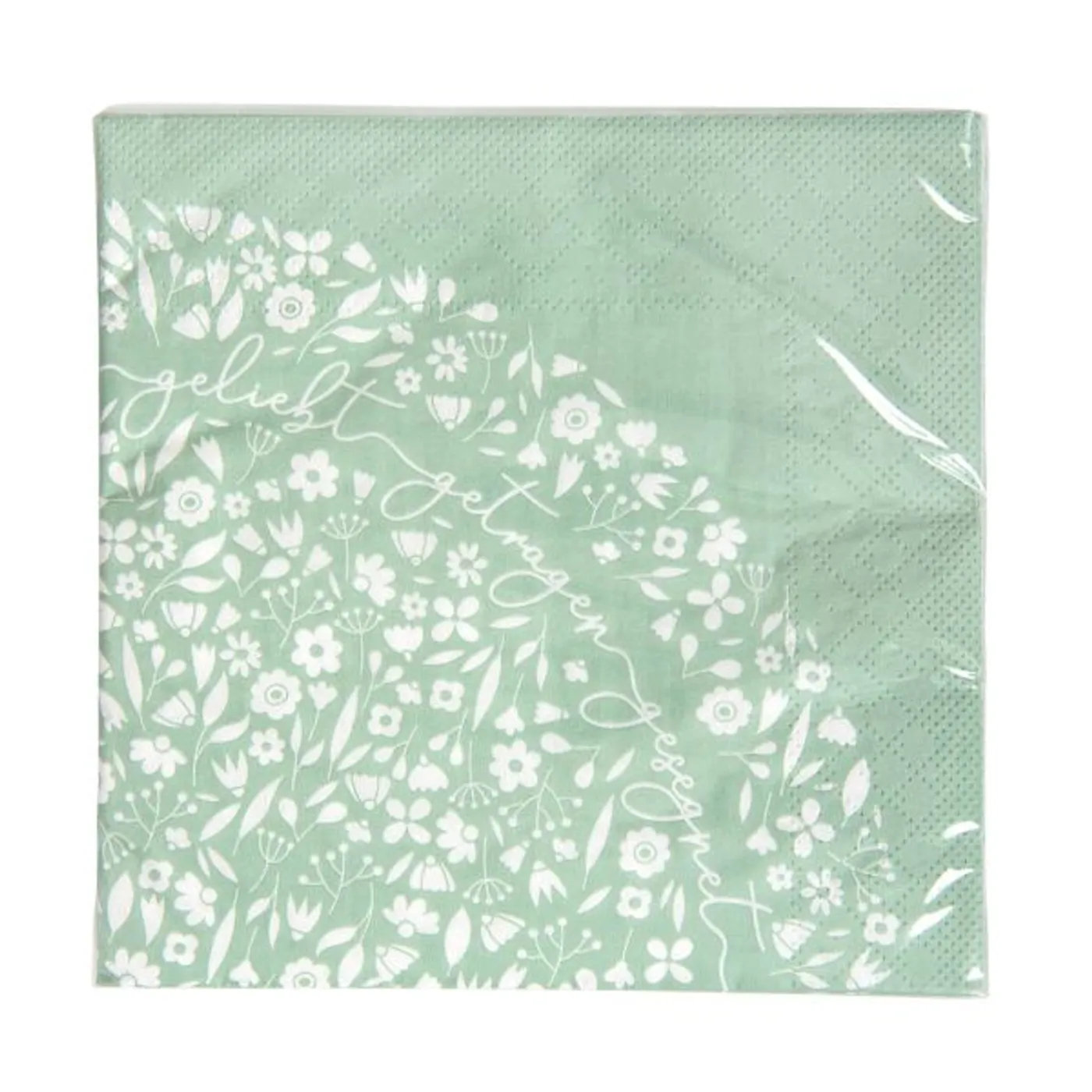 Schöne Servietten im Allover-Blümchen-Design in Trendfarbe salbeigrün. Die Worte "geliebt-getragen-gesegnet" sind in geschwungener Schrift miteinander verbunden.