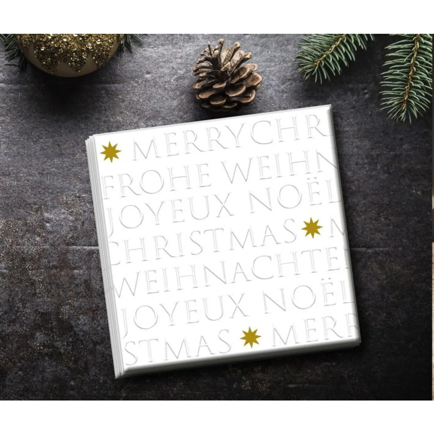 Stilvolle Servietten zu Weihnachten mit tollem Letter-Design - "Merry Christmas". Ideal für tolle Advents- und Weihnachtsessen, die Gäste werden sich freuen über solche schönen Servietten. Im praktischen rechteckige 25 x 25 cm Format und 3-lagig.